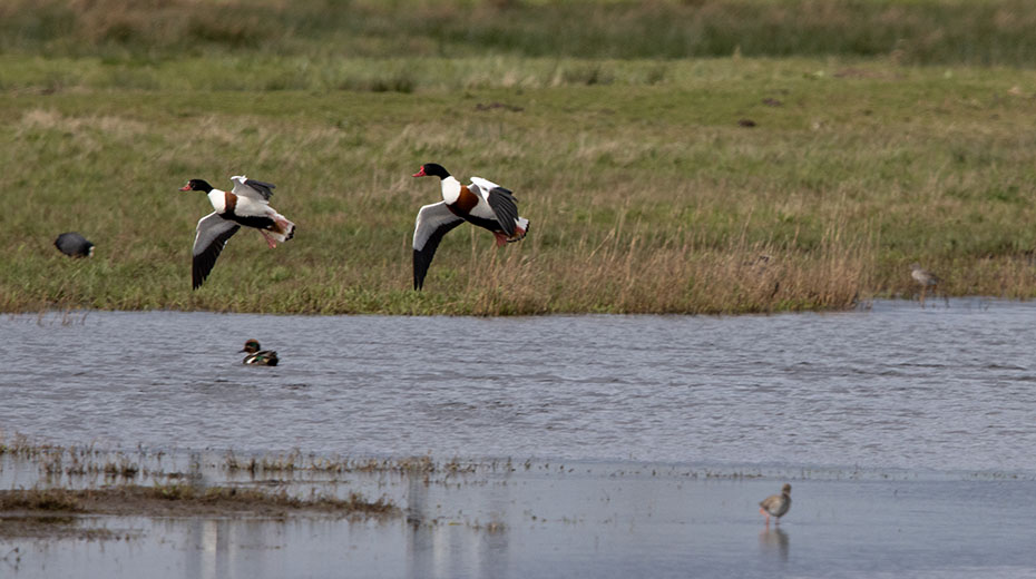 Twee bergeenden zetten de landing in. Op de foto is verder nog een meerkoet, een wintertaling en een tureluur te zien.