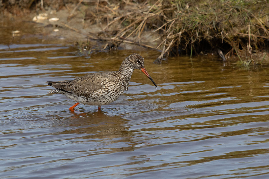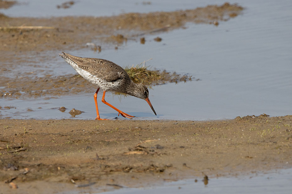 … en vervolgens op de tureluur. Even verderop foerageerde nog een tureluur. Kijkend door de lens leek het erop dat deze tureluur wat anders getekend was dan de eerste. Op internet las ik dat er nauwelijks verschil is tussen man en vrouw tureluur; het mannetje is echter zwaarder getekend en donkerder. Dan zou de tureluur op foto 2 en 3 best een mannetje kunnen zijn.