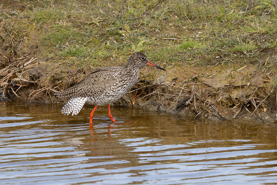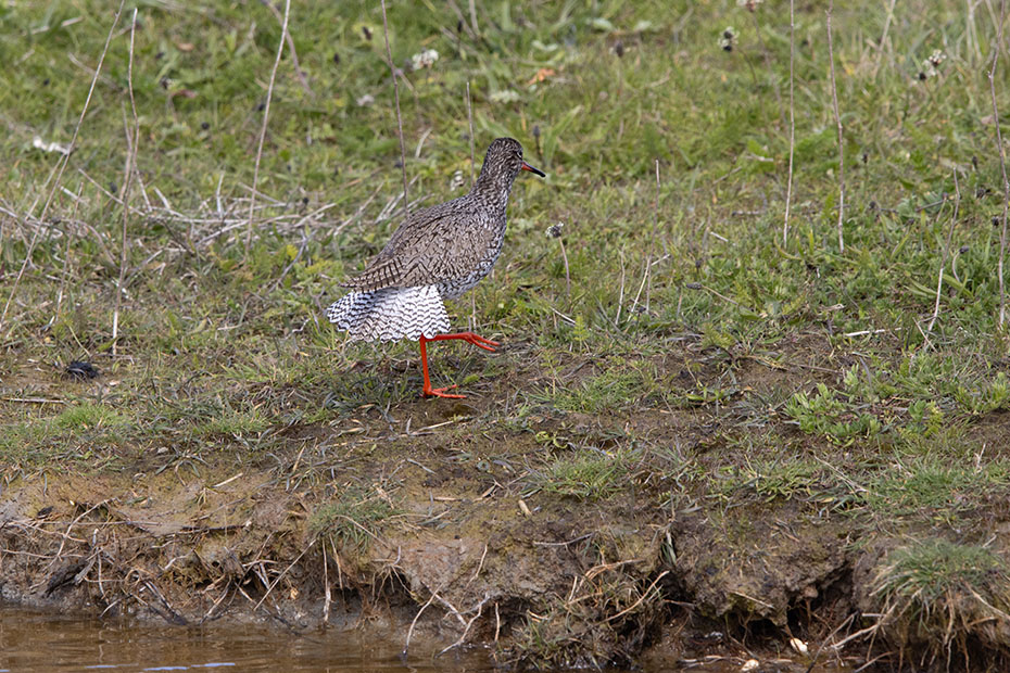 Na een tijdje vond de tureluur het welletjes en stapte op de oever. Ondertussen spreidde hij zijn staart. Dat fenomeen had ik wel eens gezien bij bijvoorbeeld de blauwborst, maar nog niet eerder bij een tureluur.