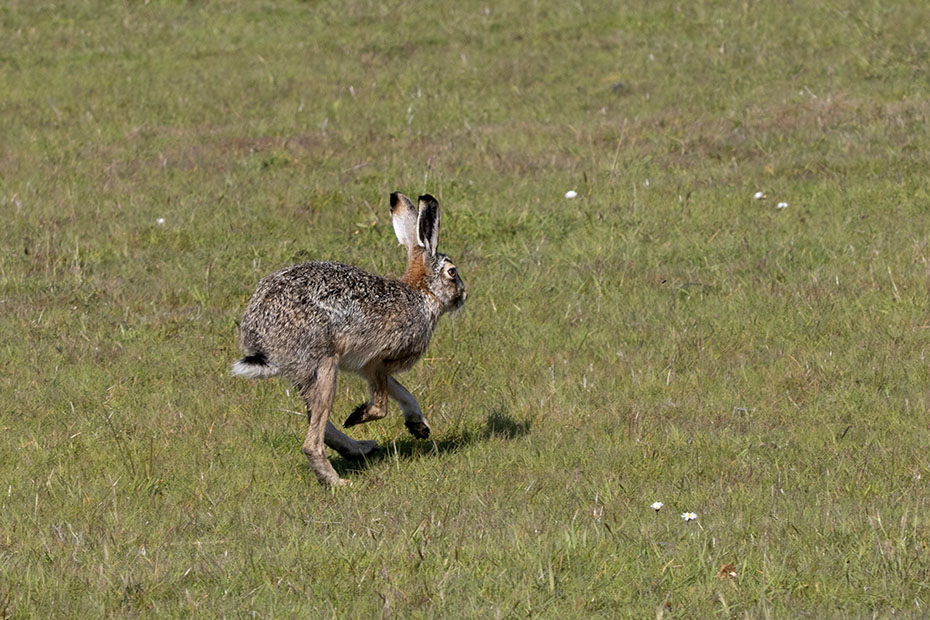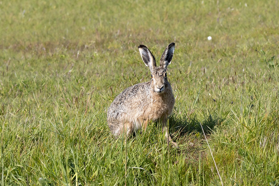 In een weiland iets verderop in Waalenburg zaten twee hazen. Aanvankelijk bleven ze rustig zitten om even later toch het hazenpad te kiezen.