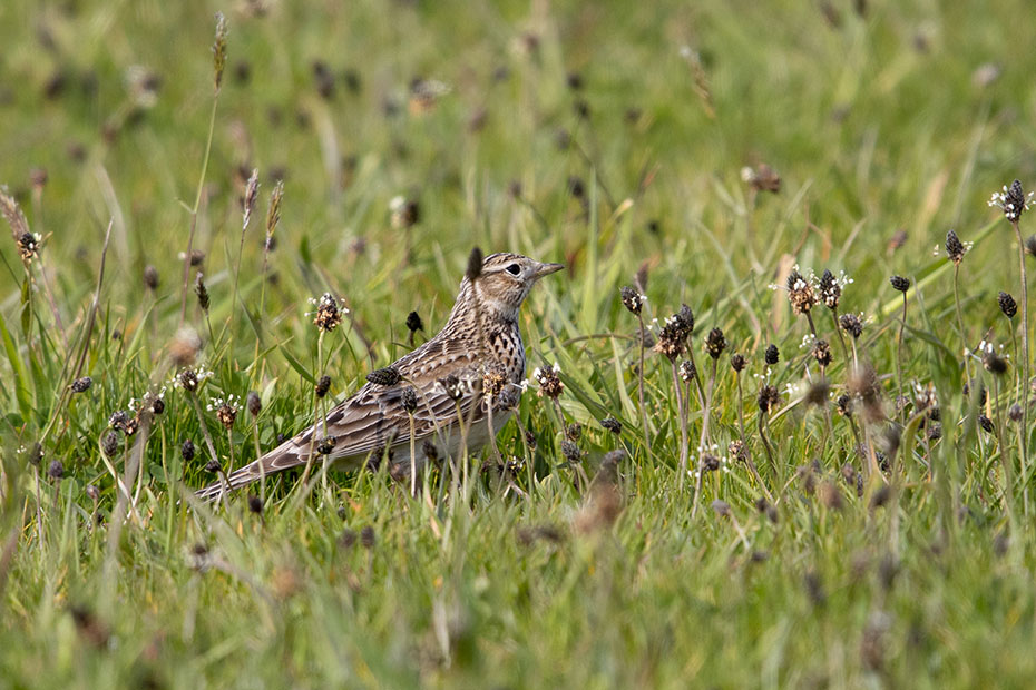 Het is geen eenvoudige vogel om te fotograferen. Als de veldleeuwerik opstijgt valt deze al snel buiten het bereik van de camera. En dat geldt ook voor het moment dat de veldleeuwerik zich weer laat ‘vallen’ in het gras. Één keer had ik geluk, een veldleeuwerik kwam al foeragerend steeds dichter naar mijn auto toe lopen.