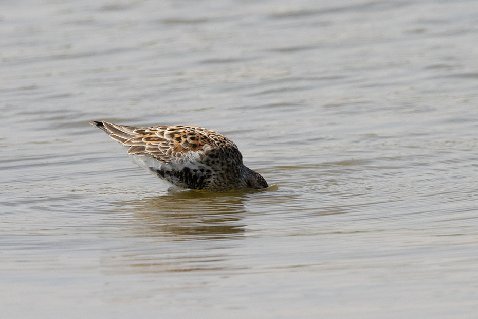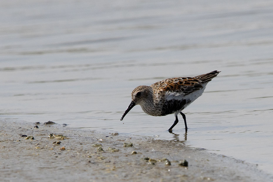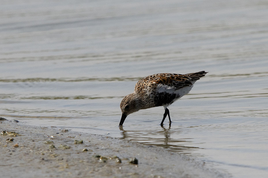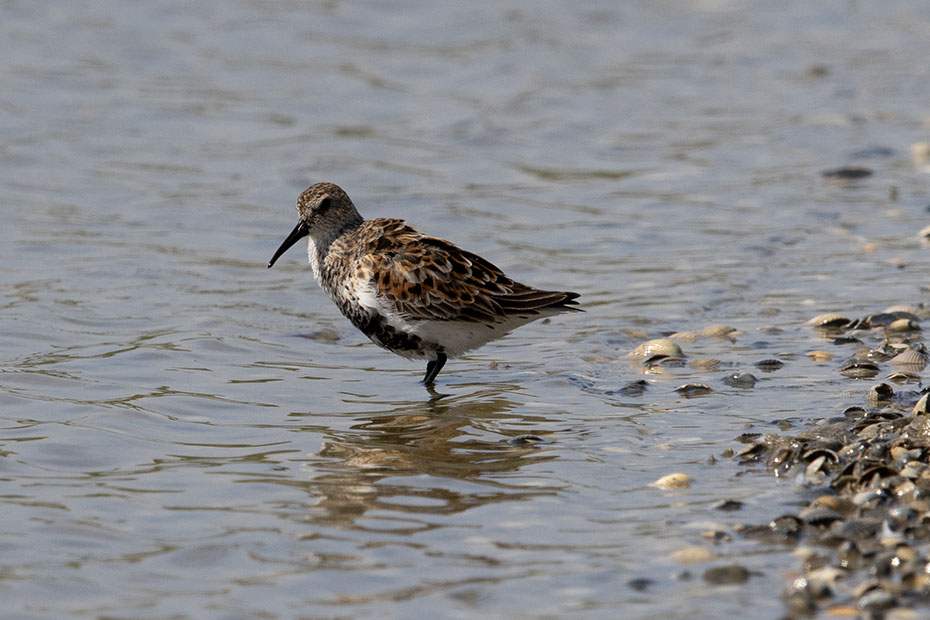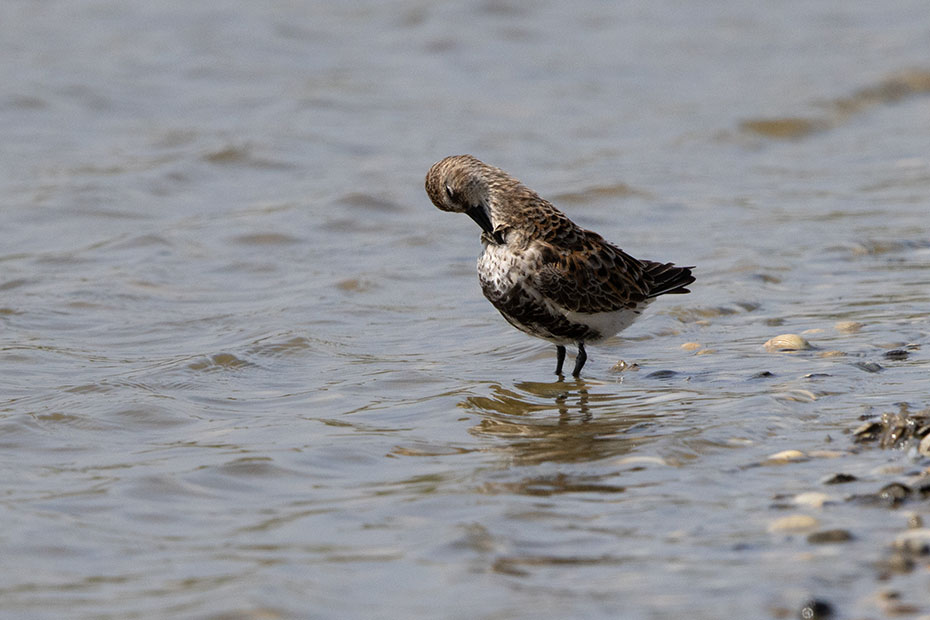Zoals de aanwezigheid van deze bonte strandloper. Al foeragerend ging de strandloper van het ene naar het andere eilandje. Daar aangekomen was er een moment van rust afgewisseld door wat poetswerk.