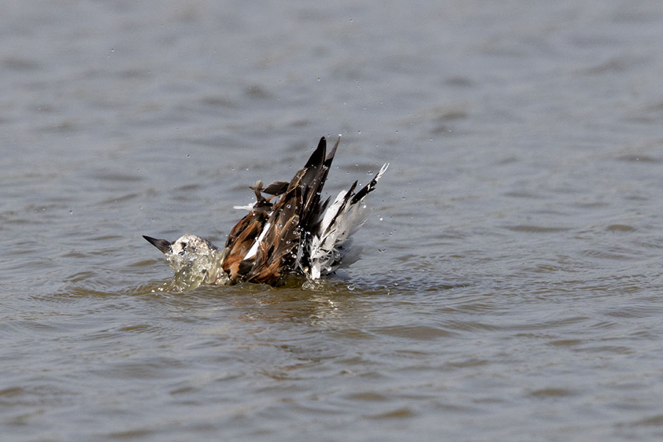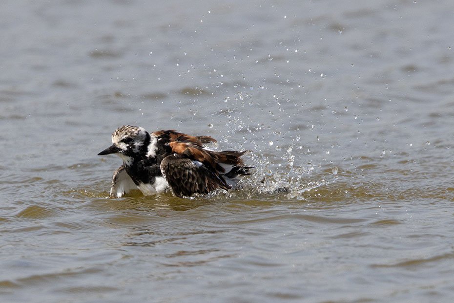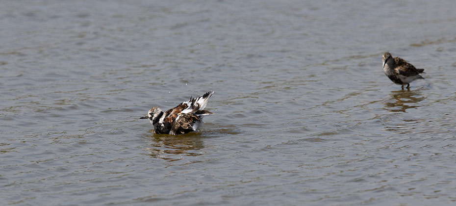 Terwijl de bonte strandloper zich daar stond te poetsen stapte er een steenloper van het eilandje het water in. Deze steenloper ging daar uitgebreid een bad nemen.