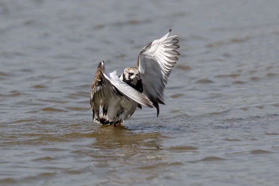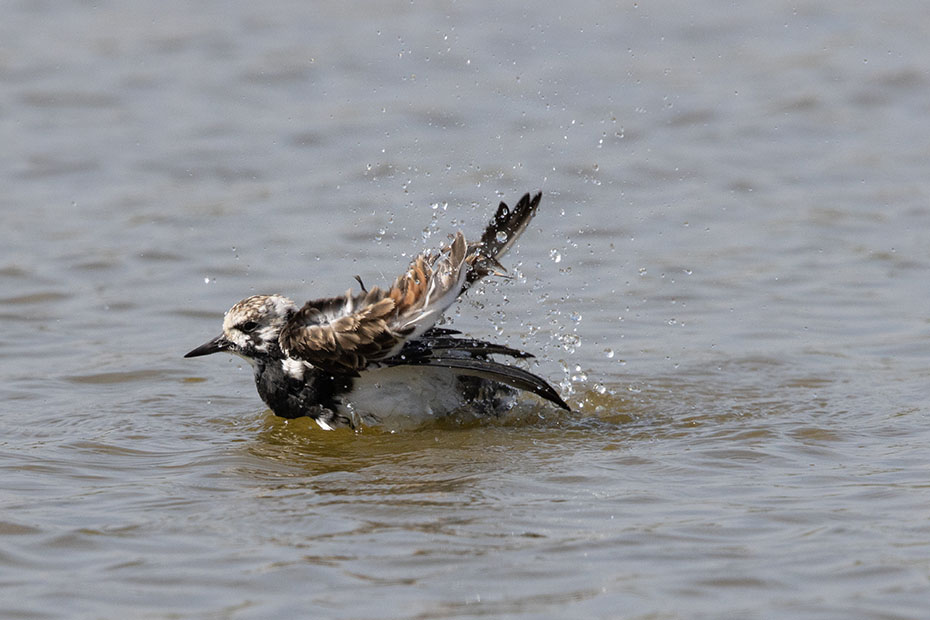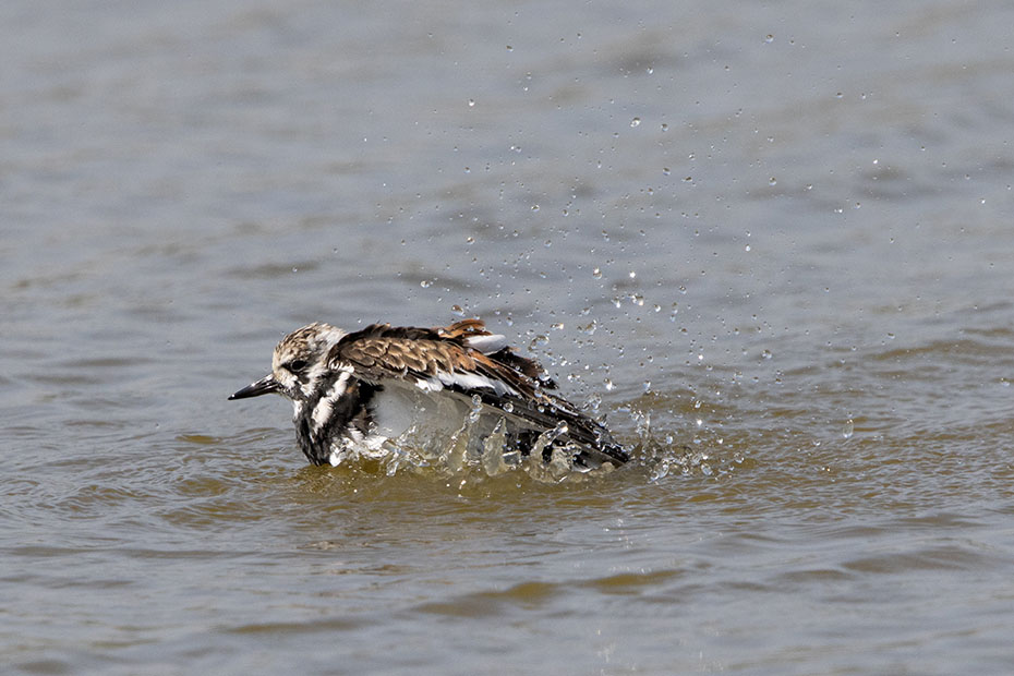 De steenloper nam geen halve maatregelen, het werd een grote beurt. Na het badderen liep de steenloper met gespreide vleugels terug naar de oever.