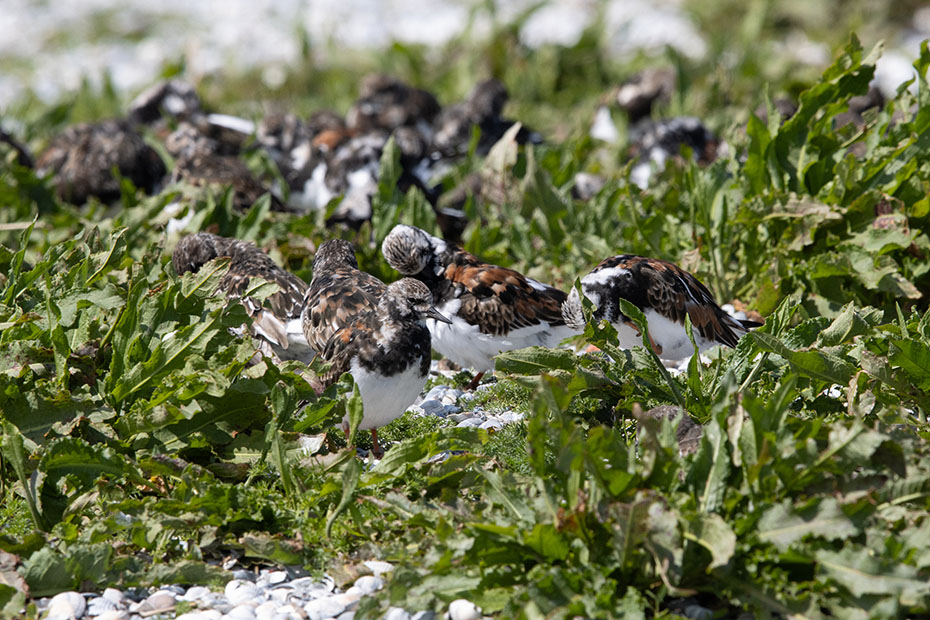 Daar vleide de vogel zich tussen de andere steenloper. Toen zag ik pas de grote groep steenlopers tussen het groen die ik daarvoor niet had gezien toen ik de rechter foto maakte.