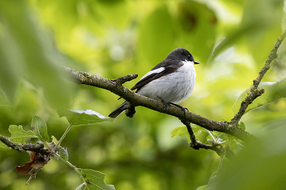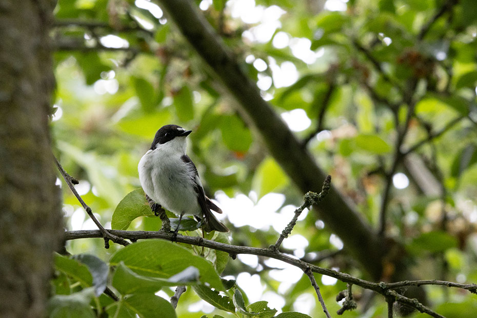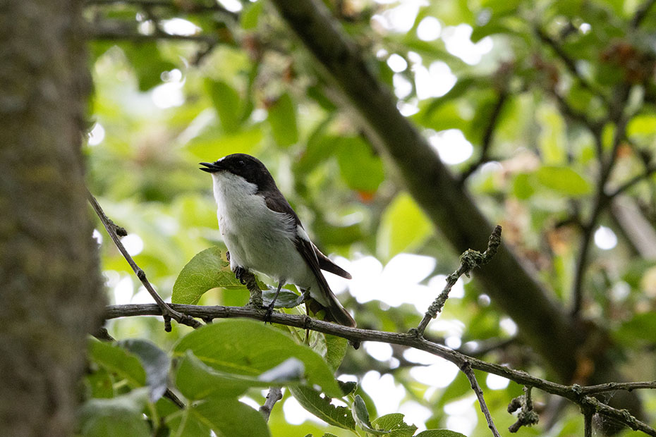 In het vorige bericht was het mij nog niet duidelijk of de bonte vliegenvanger nu wel of niet broedde in het nestkast in onze tuin. Ik ben er nu bijna van overtuigd dat er binnenin het nestkastje een vrouwtje zit te broeden. De afgelopen dagen heb ik het mannetje goed in de gaten gehouden. Op tweede pinksterdag heb ik een aantal foto’s van het mannetje gemaakt. Nu de bomen volop in blad staan is het tussen de bladeren doormikken om het vogeltje op de foto te zetten. Daarbij koos ik voor scherpstellen met de hand.