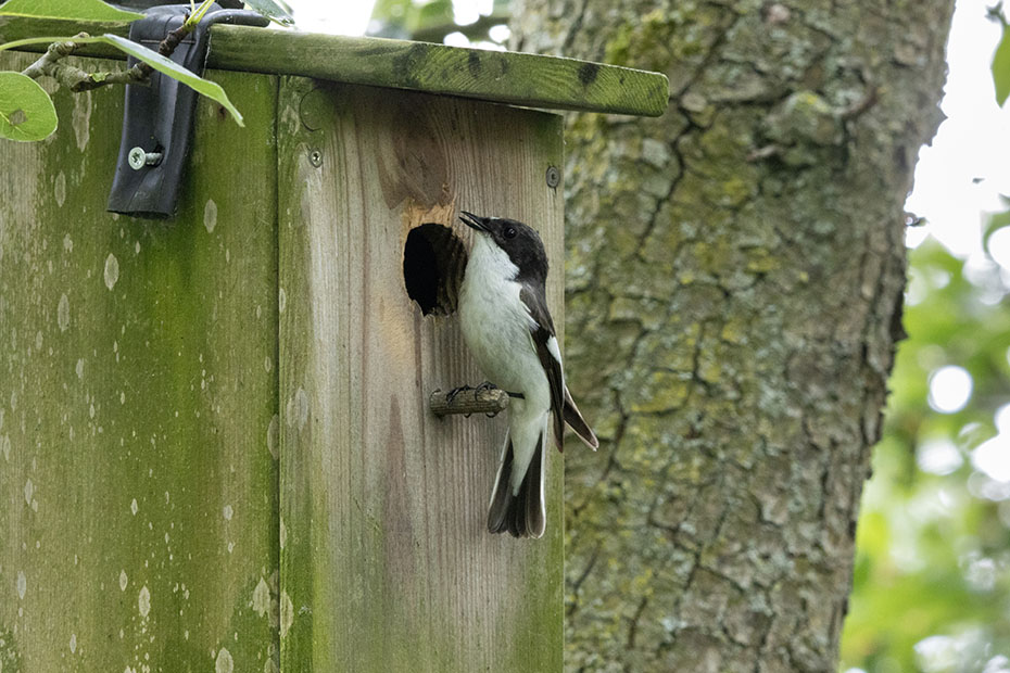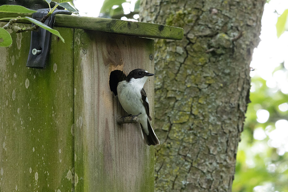 De afgelopen dagen zag en hoorde ik alleen het mannetje van de bonte vliegenvanger. Het vrouwtje was in geen velden of wegen te bekennen. Het mannetje bleef voortdurend in de buurt van het nestkastje. Hij zingt van ‘s morgens vroeg tot ‘s avonds laat om zijn territorium af te bakenen.