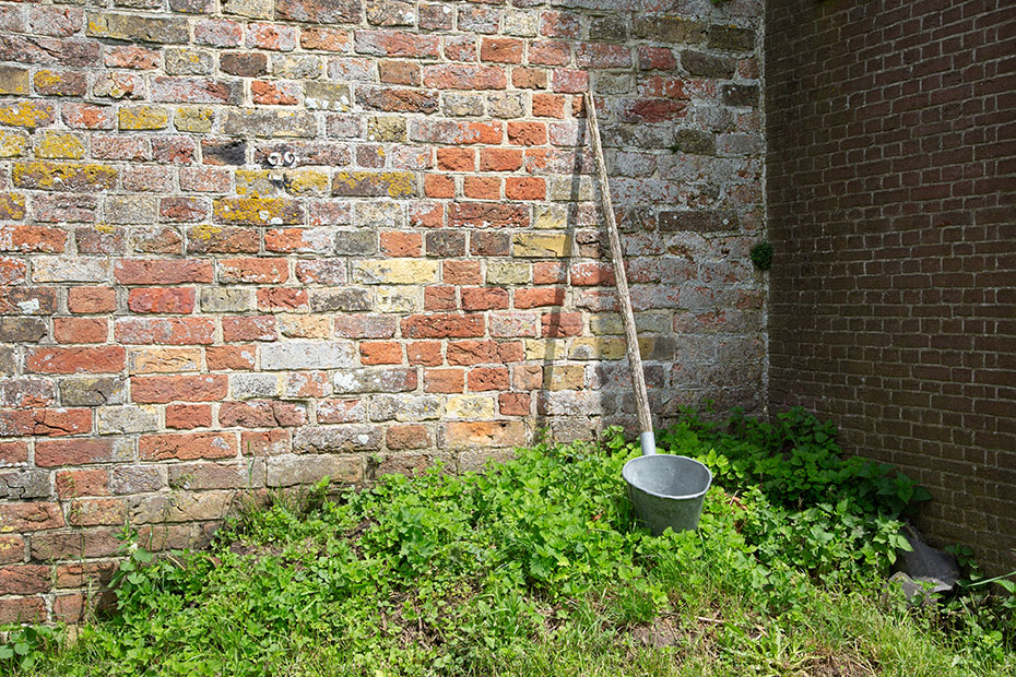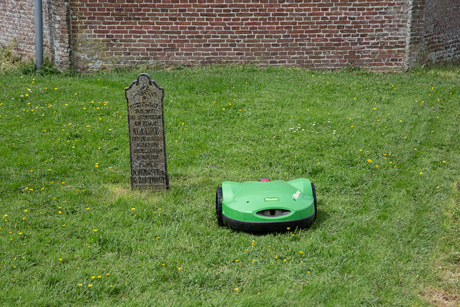 Anna en ik wandelden rond de kerk. Tegen de muur stond een oude schepemmer. Zus, Anna die ook graag fotografeert maakt tegenwoordig ook veel plaatjes met haar telefoon. Ik houd het nog altijd bij mijn oude getrouwe Canon 5D. Een robotmaaier kwam ons tegemoet. Het was even wennen aan het idee dat je dus ook op een begraafplaats een robotmaaier kunt inzetten.