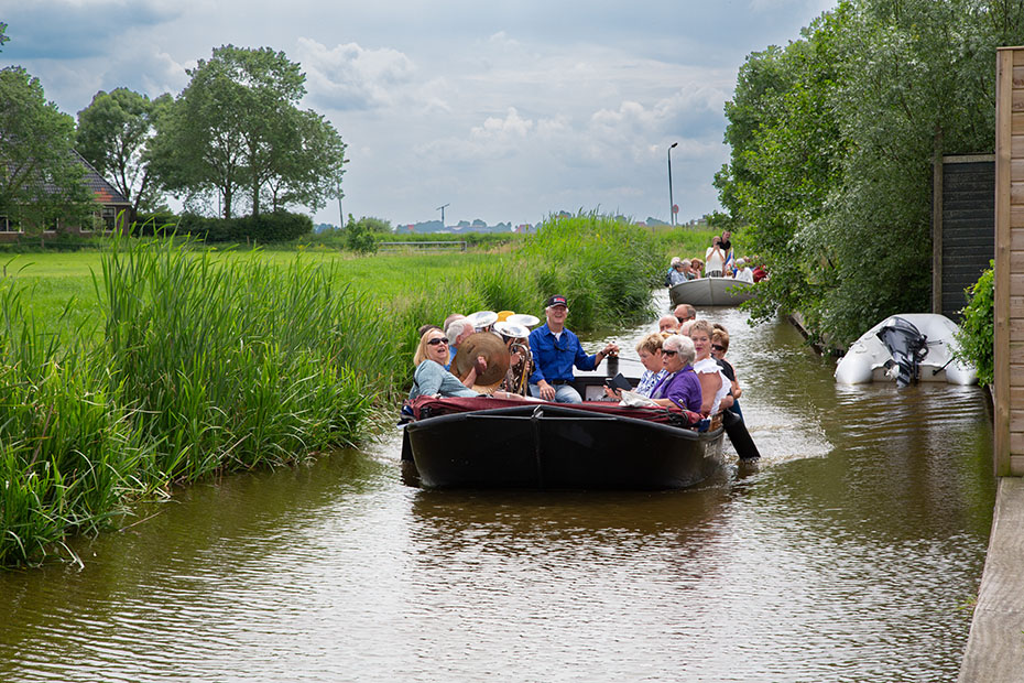 Terwijl we daar wandelden hoorden we in de verte muziek. Omdat we allebei spelen bij een fanfare trok dat meteen onze aandacht. Een bewoner informeerde ons over een groep reünisten die in boten op weg waren naar de kerk. Vanaf de kerk reden we richting de muziek en al snel vonden we de boten met de vrolijke feestgangers.