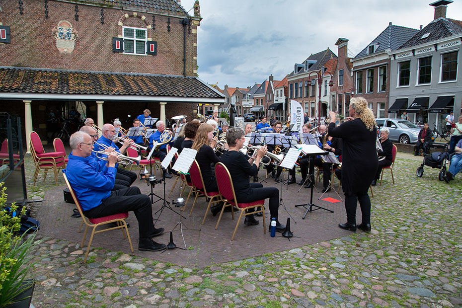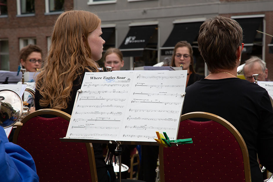 Op hetzelfde moment kwamen de familieleden aangelopen die te voet naar Workum waren gegaan. Met elkaar streken we neer op het terras. Terwijl we daar heerlijk zaten met een versnapering werd er vlak naast ons terras stoelen klaargezet. Even later bracht de Fanfare uit Koudum het nummer ‘Where Eagles Soar’ ten gehore. Er was veel publiek. Wij hadden als muziekzussen wederom geluk met dit optreden.