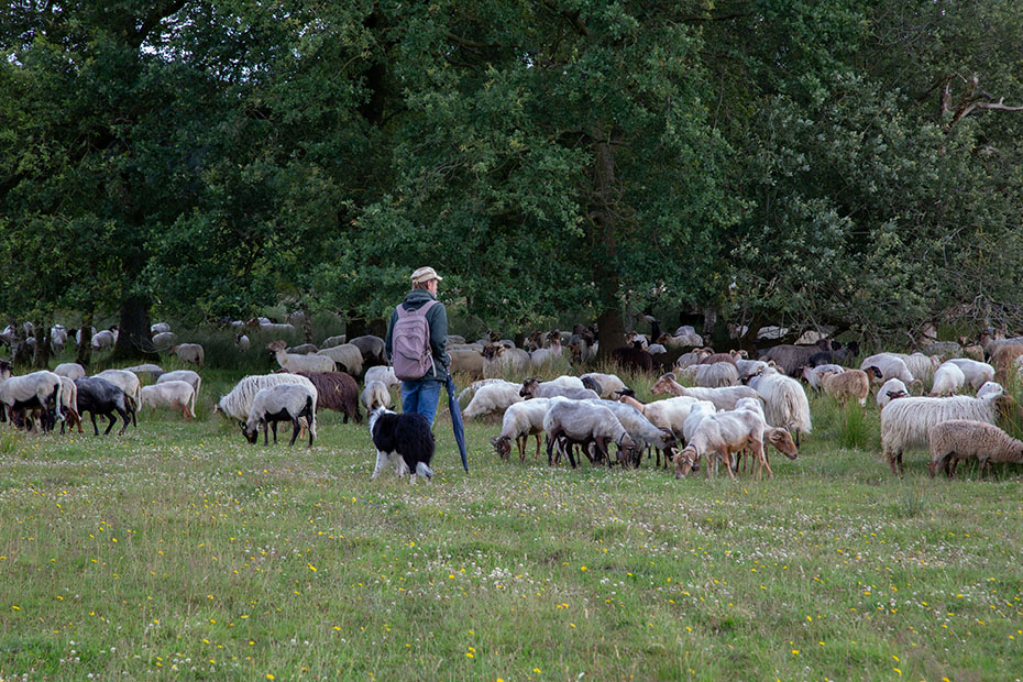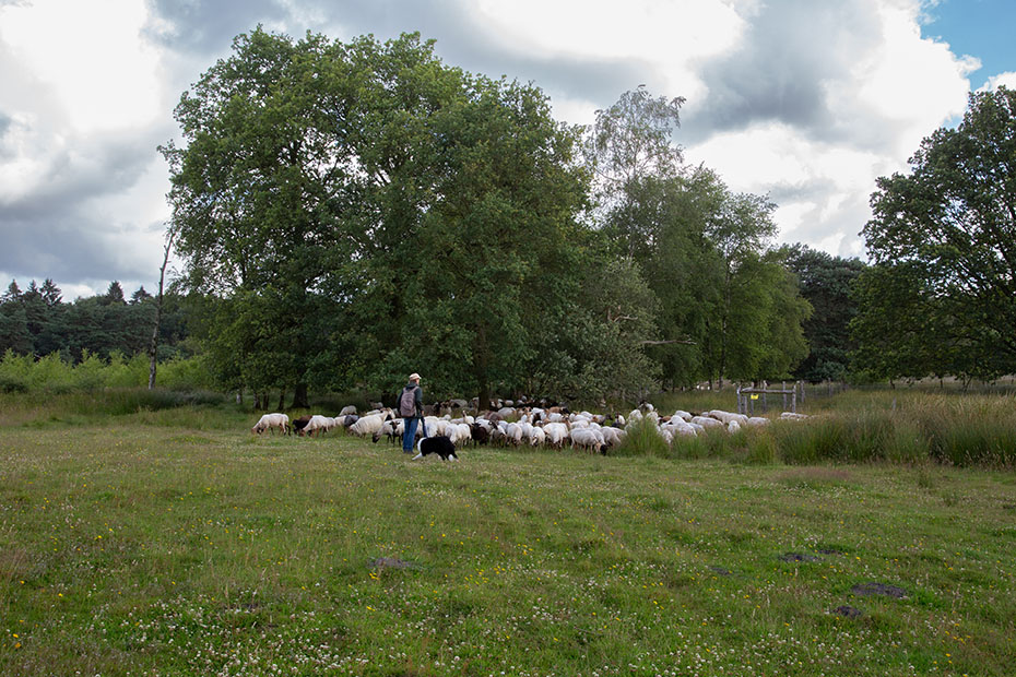 Terwijl ik daar met de fiets aan de hand het wandelpad volgde kwam de herder met zijn schaapskudde mij tegemoet.