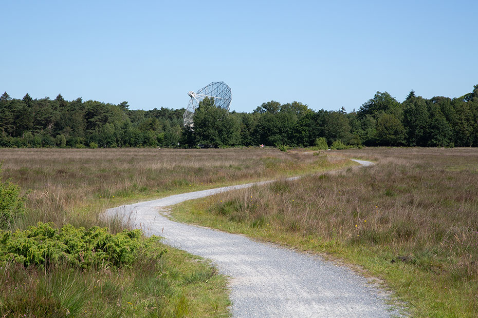 Onderweg stopte ik om foto’s te maken. De radiotelescoop torent als baken boven het Dwingelderveld. Op de rechter foto zie je hoe mooi de heide tot bloei is gekomen op een strook wat een aantal jaren geleden is afgeplagd.