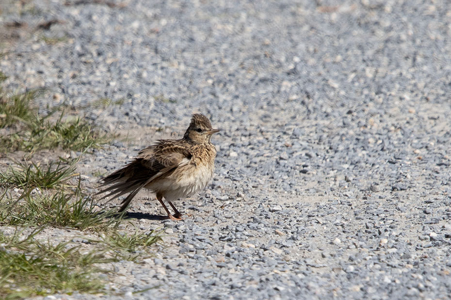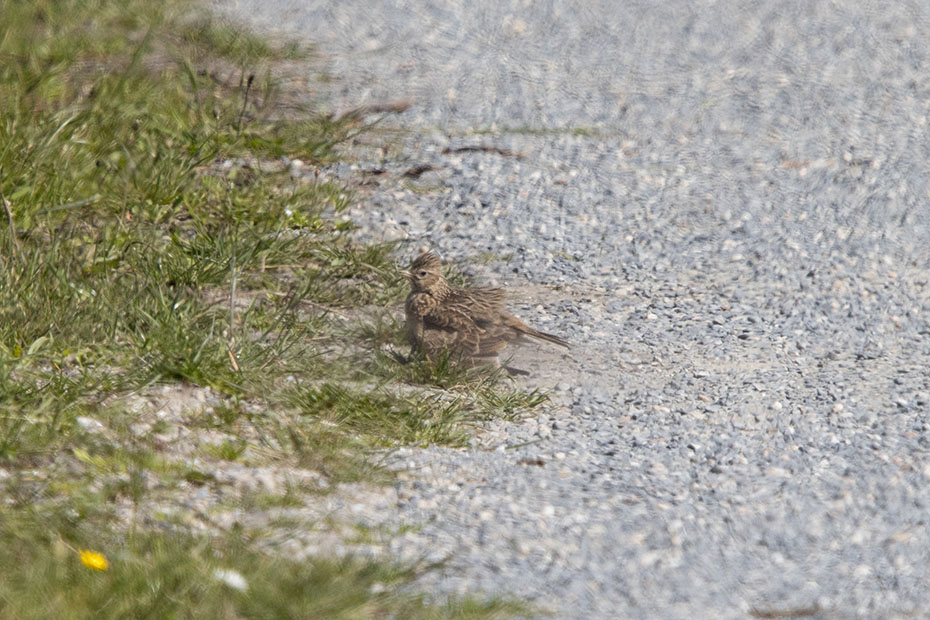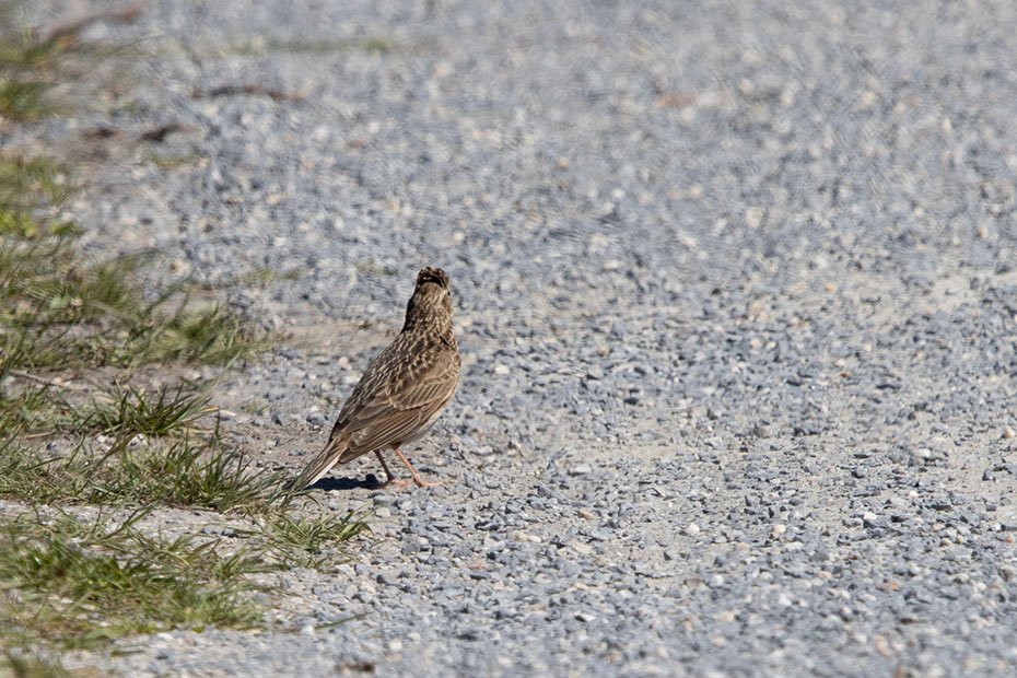 Tijdens een van de stops waarbij ik achterom keek zag ik een vogeltje rondscharrelen op het fietspad. Kijkend door telelens zag ik dat het een veldleeuwerik was die een zandbad nam.