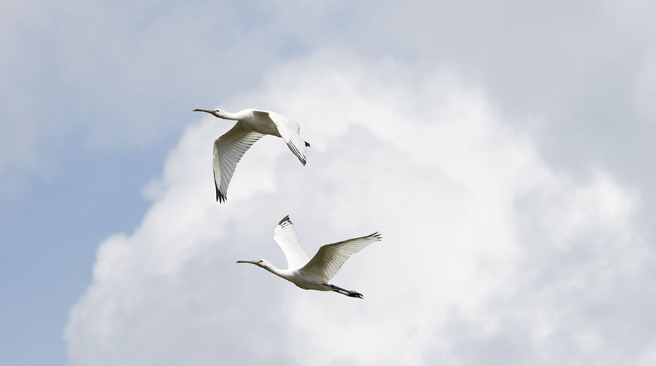 Geduldig speurde ik het luchtruim af op naderende grote vogels. Ik had geluk, er kwam een formatie lepelaars aanvliegen. Toen ik de foto’s op de computer zag kreeg ik de indruk dat het juveniele lepelaars waren.