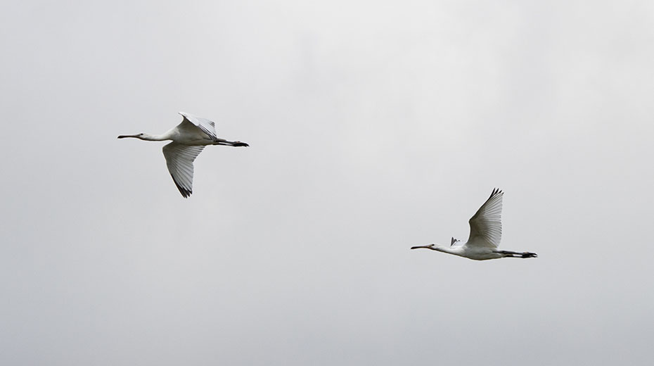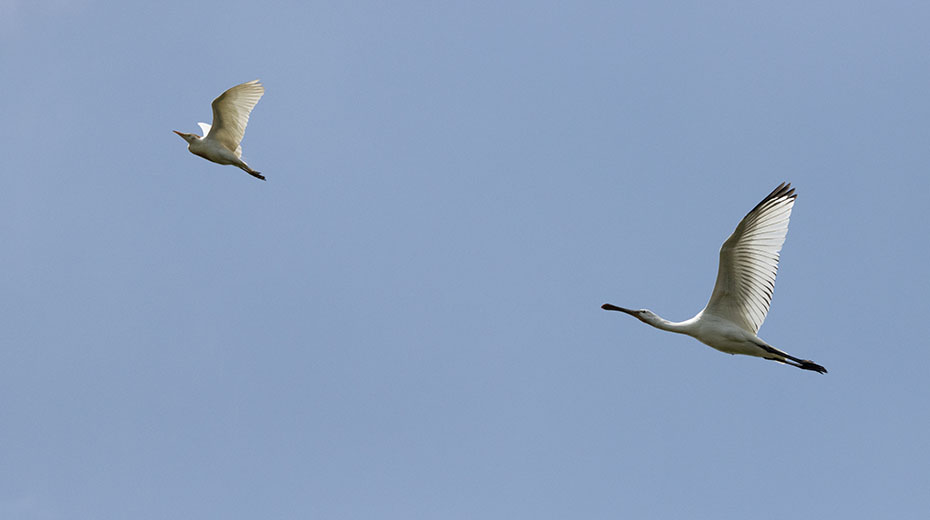 Lepelaars in vlucht vind ik altijd een mooie verrassing, maar nog groter wordt de verrassing als voorin de formatie ook nog een koereiger vliegt.