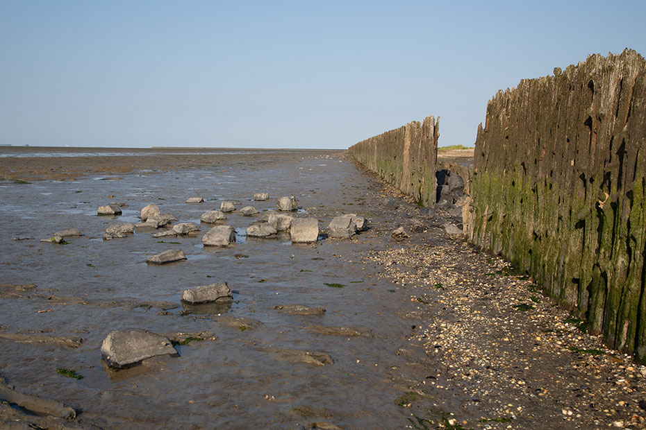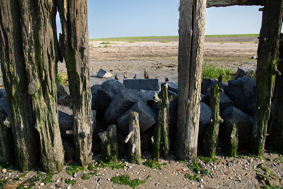 Aan de zuidoostkant van de palenrij liggen basaltblokken. Ze worden tegengehouden door de palenrij of beter gezegd, wat daar nog van over is. Als er geen palen meer zijn om de stenen vast te houden spoelt de zee ze weg. Ook een paar doorkijkjes mogen niet ontbreken.