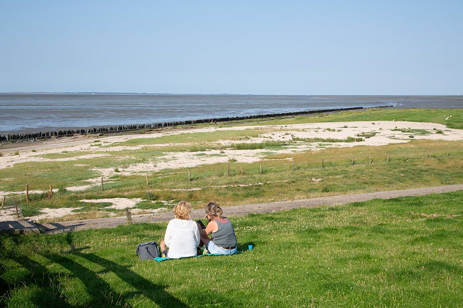 Op het Wad bij Paesens-Moddergat staat een halfvergane palenrij. Zie Google Maps. Deze palenrij is een geliefd object bij fotografen. Ik reed bij eb naar het Wad om er een fotoserie van te maken. Bij mooi weer is het gezellig op de Waddendijk. Mensen zitten op bankjes of in het gras te kijken, te lezen of te picknicken zoals deze dames.