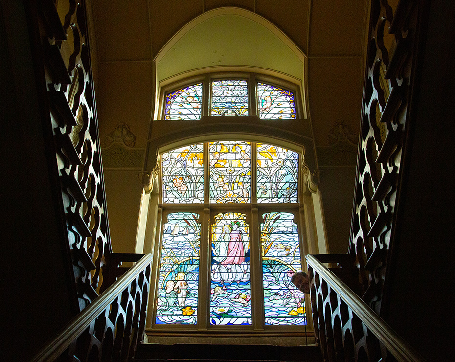 Mijn man en onze zoon waren alvast de trap opgelopen. Ik wachtte onderaan de trap totdat ze uit beeld waren, want ik wilde nog een foto maken van het prachtige glas-in-lood raam. Toen ik door de zoeker van de camera keek zag ik wel een heel bijzonder beeld verschijnen. Onze zoon heeft humor. 😉