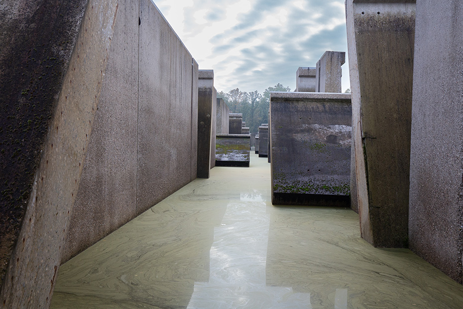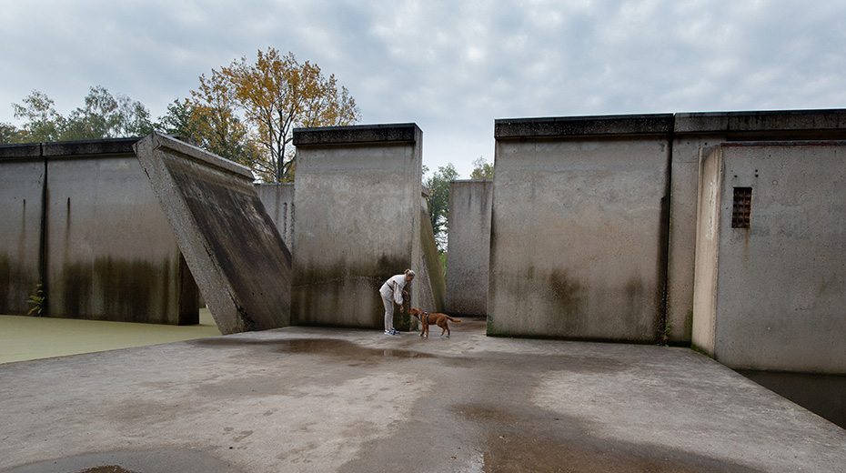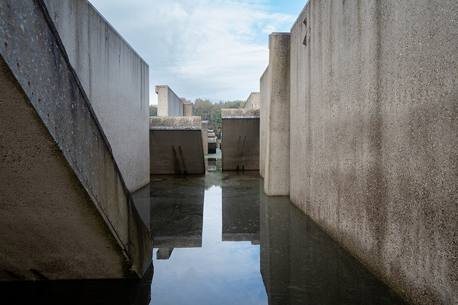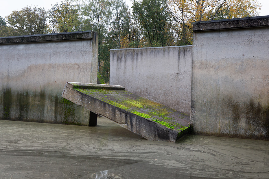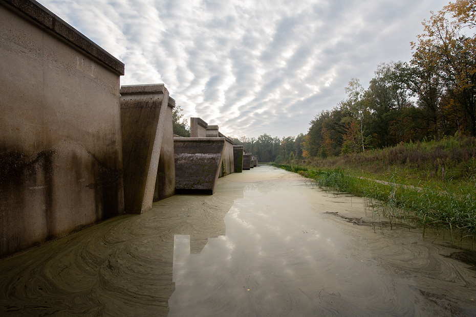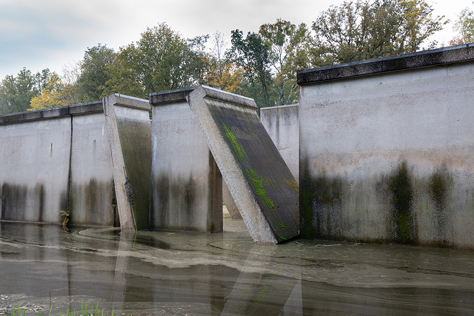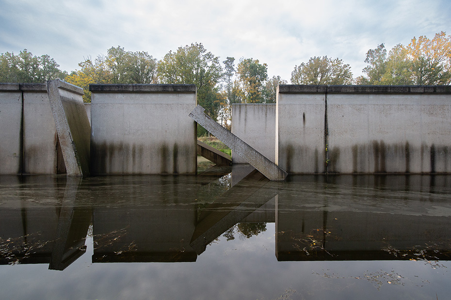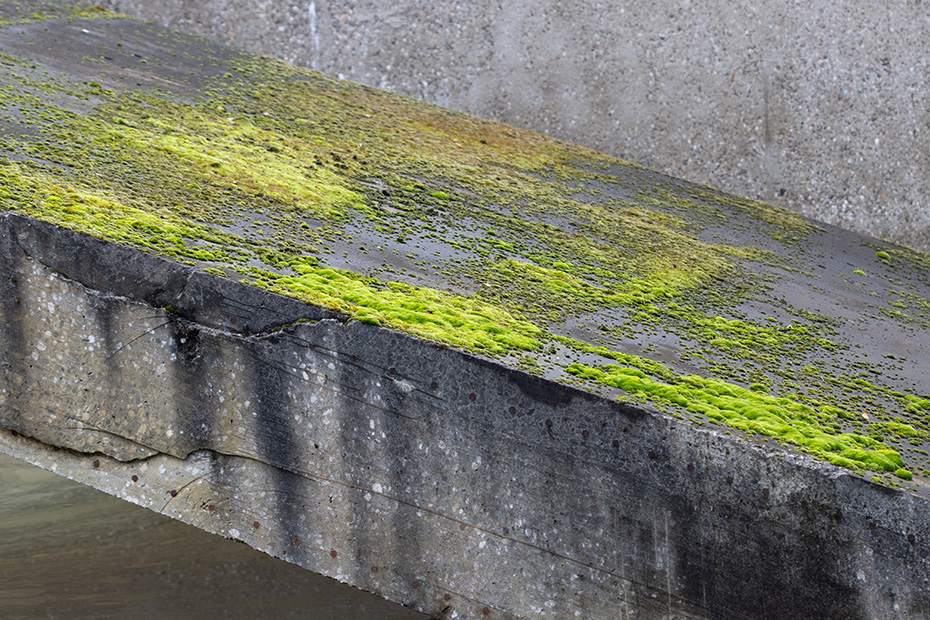 Op het water dreef een dun laagje alg wat helaas de weerspiegeling van het kunstwerk verhinderde. Door de jaren heen zijn de betonelementen steeds meer begroeid door planten en (korst)mossen. Het viel mij op dat het beton op meerdere plekken beschadigd was. Dat in tegenstelling tot een aantal jaren geleden wat bevestigd werd door mijn eerdere fotoserie.