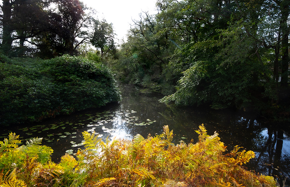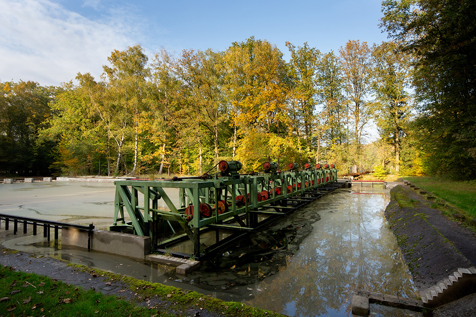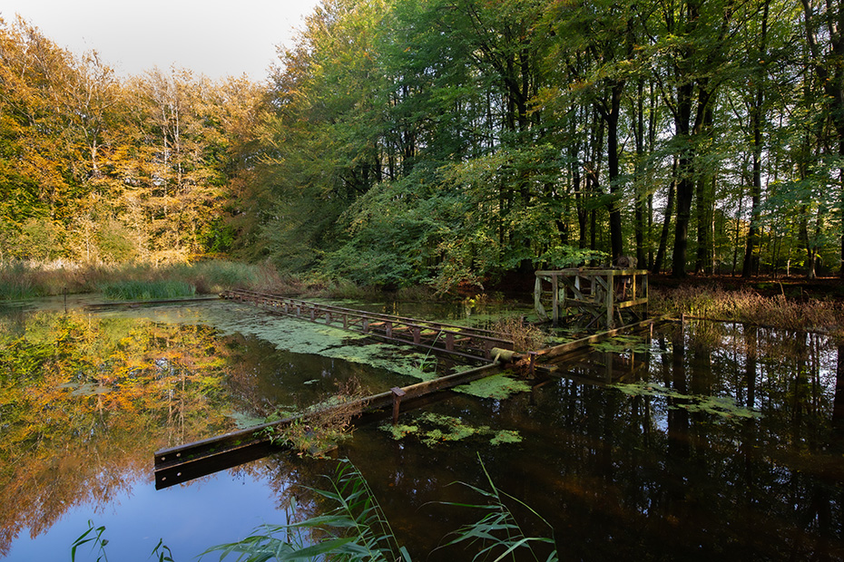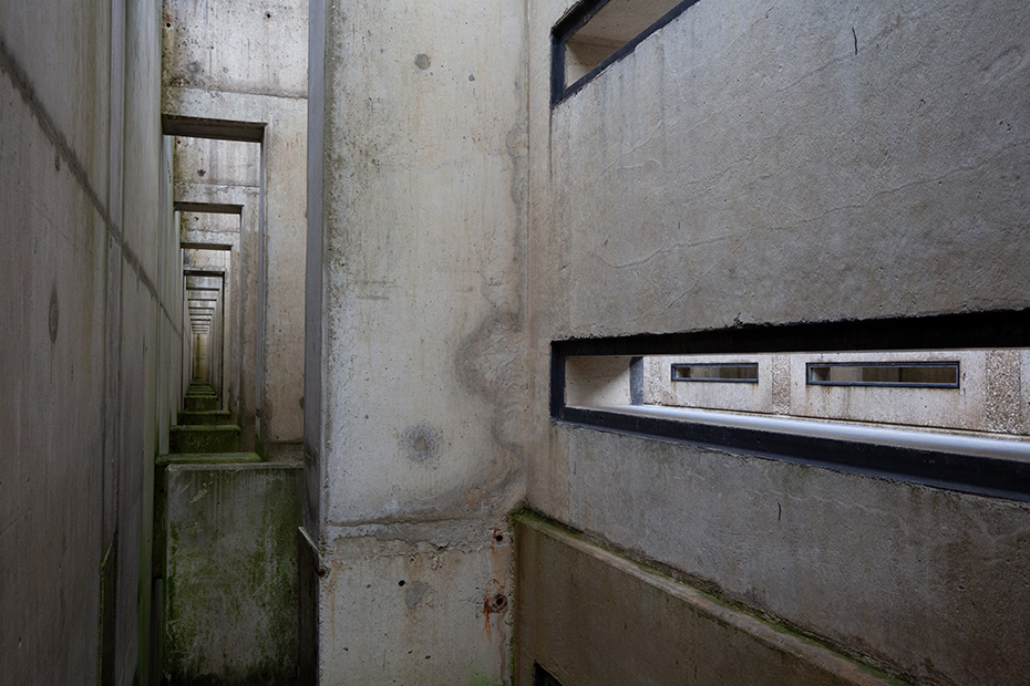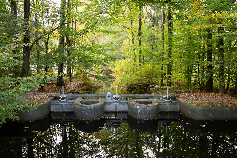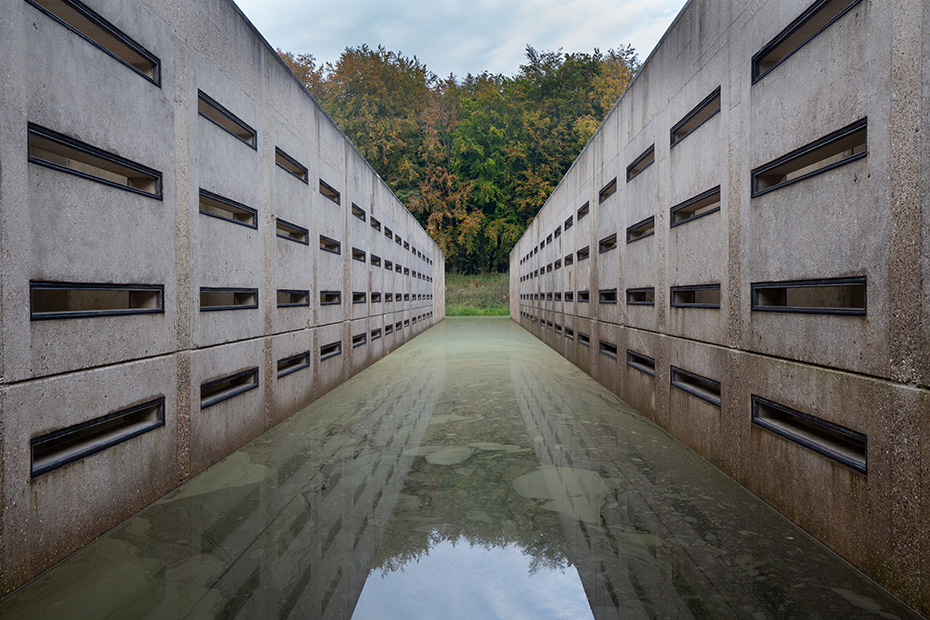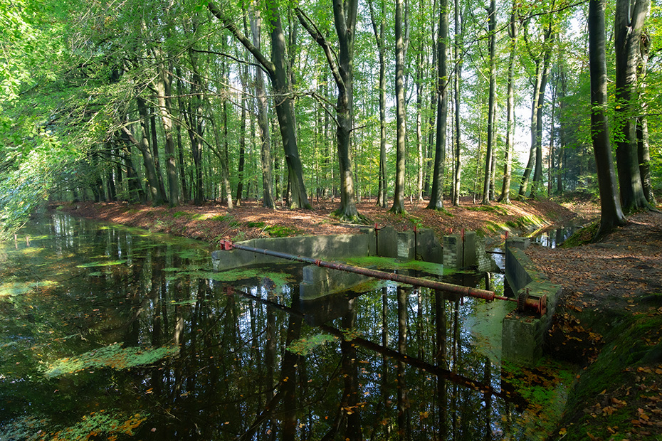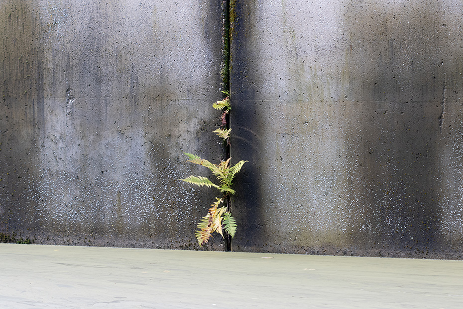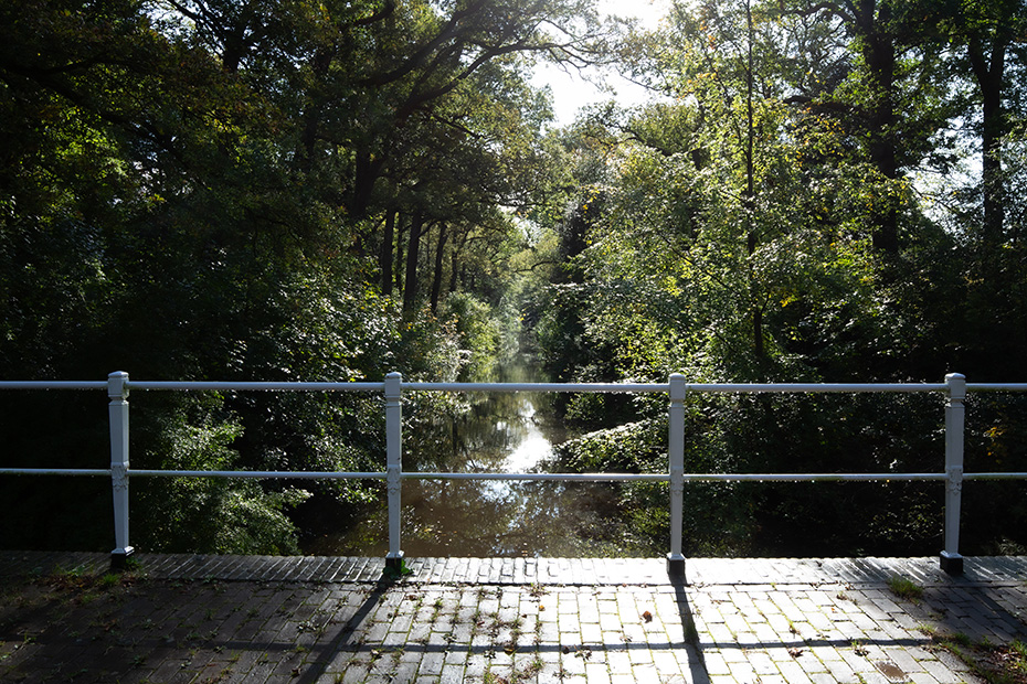 Op het water dreef een dun laagje alg wat helaas de weerspiegeling van het kunstwerk verhinderde. Door de jaren heen zijn de betonelementen steeds meer begroeid door planten en (korst)mossen. Het viel mij op dat het beton op meerdere plekken beschadigd was. Dat in tegenstelling tot een aantal jaren geleden wat bevestigd werd door mijn eerdere fotoserie.