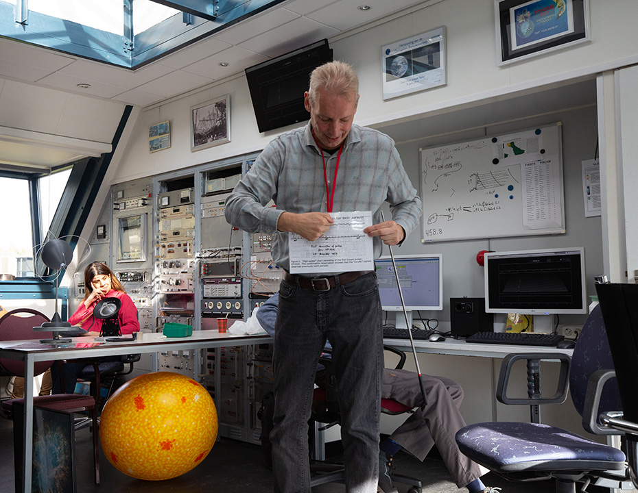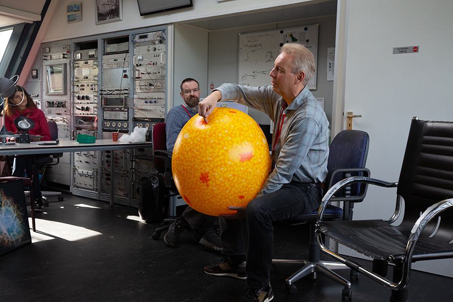 Bij de receptie kon ik kiezen uit meerdere rondleidingen. Uiteraard koos ik voor de radiotelescoop. Ik kon direct weer terugwandelen, want ik zat in de eerste groep. Vrijwilligers vertelden o.a. over de uitbarstingen op de zon, de werking van zwarte gaten en ze lieten de pulsar horen van een dode ster.