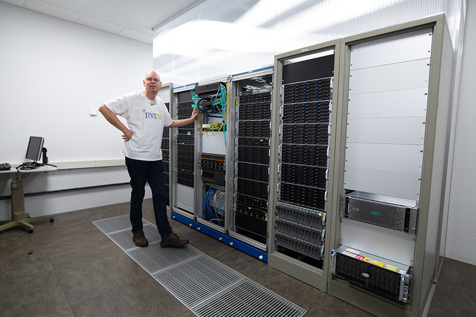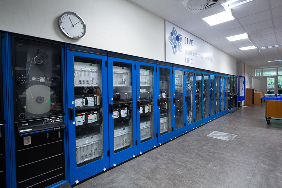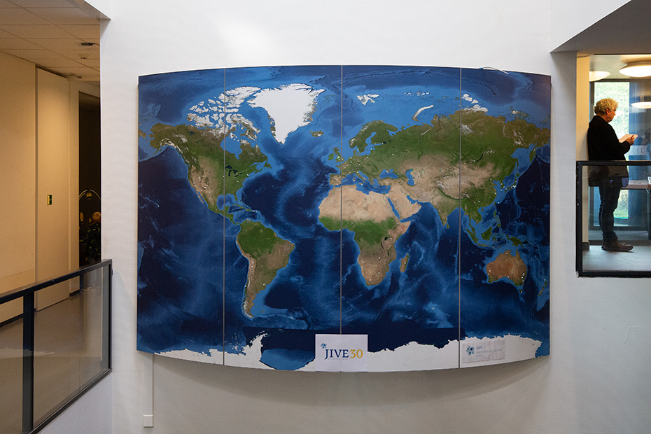 Na het bezoek en de uitleg bij de radiotelescoop wandelde ik terug naar het hoofdgebouw. Daar ging ik eerst kijken bij JIVE. JIVE ( Joint Institute for VLBI ERIC) is opgericht in 1993. Het instituut koppelt de radiotelescopen in diverse landen, zodat één grote telescoop ontstaat. Vroeger stuurden de telescopen hun gegevens op losse harde schijven per post naar Dwingeloo. Tegenwoordig stromen de meeste gegevens direct van de telescopen via glasvezelverbindingen naar de supercomputer van JIVE. Daardoor kunnen sterrenkundigen veel beter plotselinge, kortdurende gebeurtenissen bestuderen zoals supernova-explosies en gammaflitsen. Zie deze site.