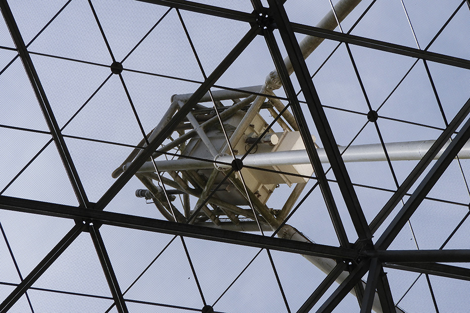 Terwijl wij binnen waren draaide de radiotelescoop om zijn as. Ik heb daar met de telefoon een kort filmpje van gemaakt. Behalve dat de telescoop 360 graden kan draaien kan het scherm ook kantelen. Zo kan het gehele universum worden afgespeurd.