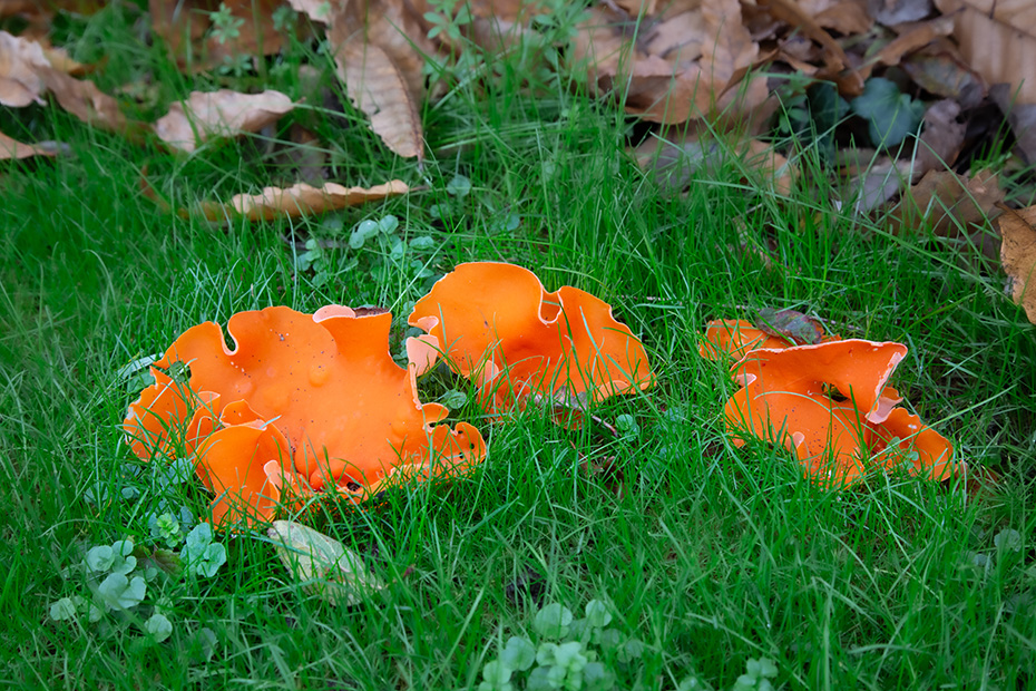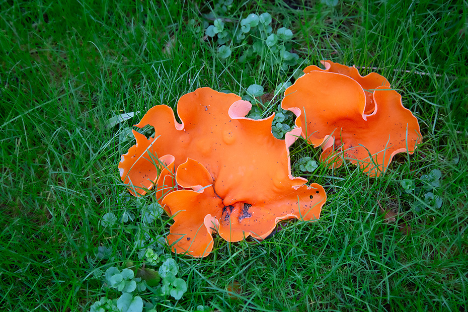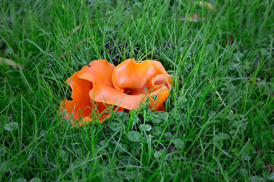 Eenmaal thuis troonde mijn man me mee naar de achtertuin. Daar had hij namelijk in het gras een kleurrijke zwam ontdekt. Ze stonden vlakbij de plek waar wij voor de dieren een rommelhoekje hebben gecreëerd. Het is de grote oranje bekerzwam.