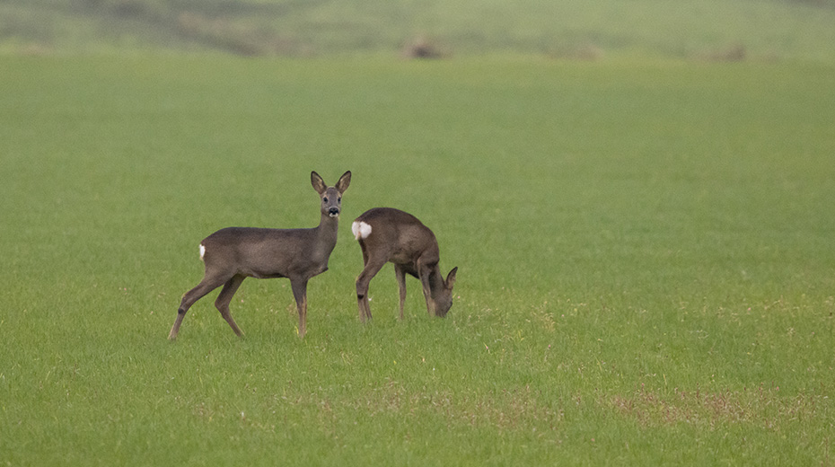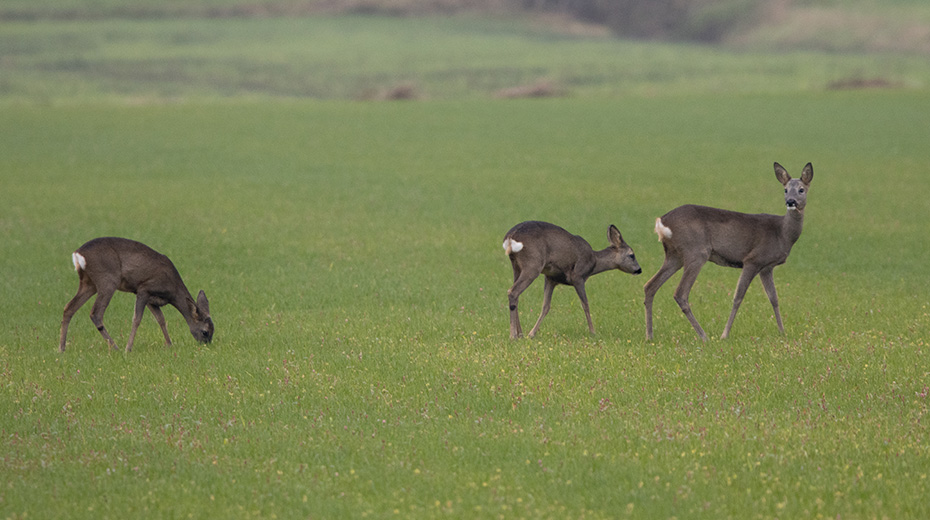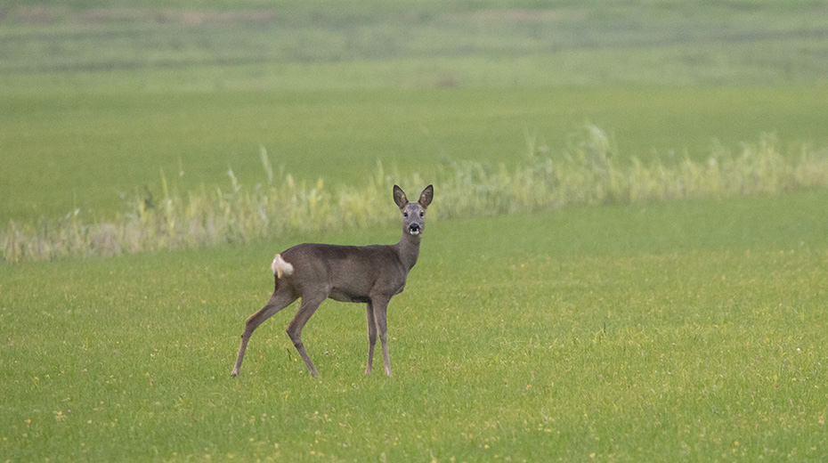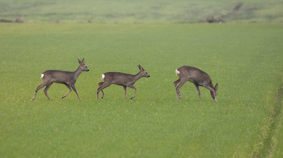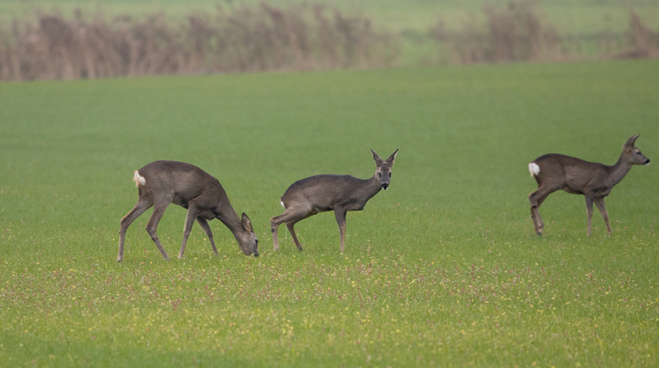 Vervolgens reden we verder richting de kijkhut in de Jan Durkspolder. Op weg daar naartoe werden we op de Westersânning verrast door een sprong reeën. Jan hield de omgeving scherp in de gaten, want ze worden daar wel vaker gezien. En met succes! Ondanks dat ik uitstapte om achter uit de auto mijn camera met telelens te pakken, bleven ze op het perceel. Zo kon ik deze fotoserie maken. Wat een geluk!