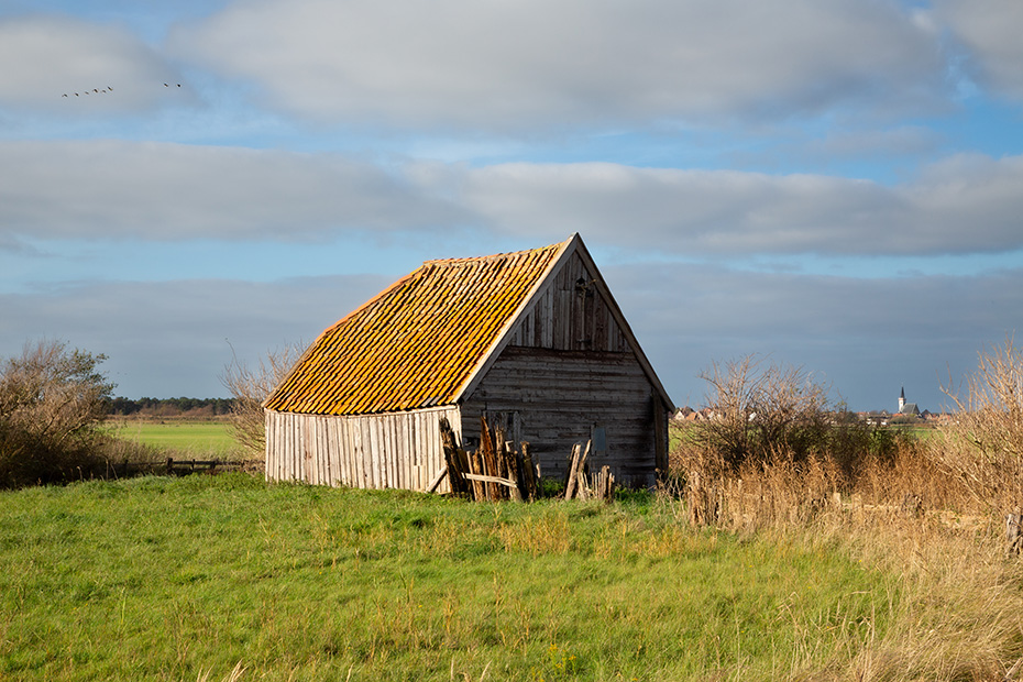 Tijdens een van mijn fotokuiers op Texel bezocht ik de Horspolders. Onderweg daarheen maakte ik een foto van een schuur die me opviel. Hoewel de schuur niet de de authentieke vorm heeft van een traditionele Texelse schapenboet, wordt deze aldus deze site er toch voor aangezien. Op de achtergrond, aan de rechterkant is de kenmerkende witte toren van de kerk in Den Hoorn te zien.