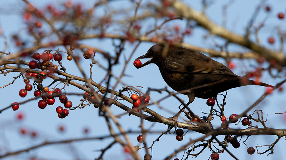Een merel was zich tegoed aan het doen aan de oranje bessen van, vermoedelijk, een duindoorn. Net als bij de keep en het roodborstje kreeg ik ook van de merel slechts de kans om één foto te maken voordat hij uit beeld verdween en niet meer terugkeerde. Een kort, maar toch waardevol moment om vast te leggen.