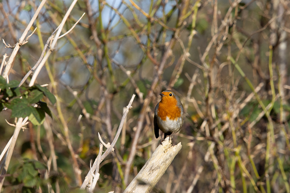 Even verderop landde een roodborstje op een dode tak. Het leek net alsof het enigszins vleugellam was, maar dat weerhield het er niet van om al snel weer het luchtruim te kiezen. Het korte moment van rust bood mij net genoeg tijd om het vogeltje vast te leggen voordat het wegvloog