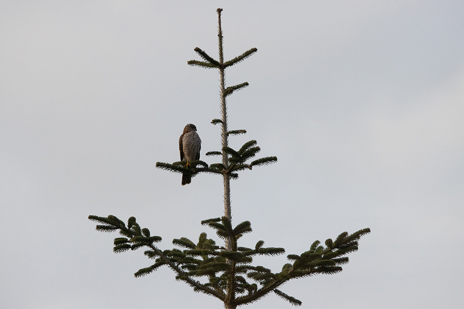Eind december kwamen Jan en Aafje bij ons op bezoek voor een kopje koffie. Ze hadden zich georiënteerd op een demontabele elektrische rolstoel in een stad hier in de buurt. Terwijl we aan de koffie zaten landde er een sperwer in een kerstboom op het perceel naast onze tuin. Vanuit de woonkamer maakte ik snel een paar foto’s. Toen ik voorzichtig naar buiten sloop vloog de sperwer weg. Jammer. Jan baalde ervan dat hij zijn camera in de auto had laten liggen.