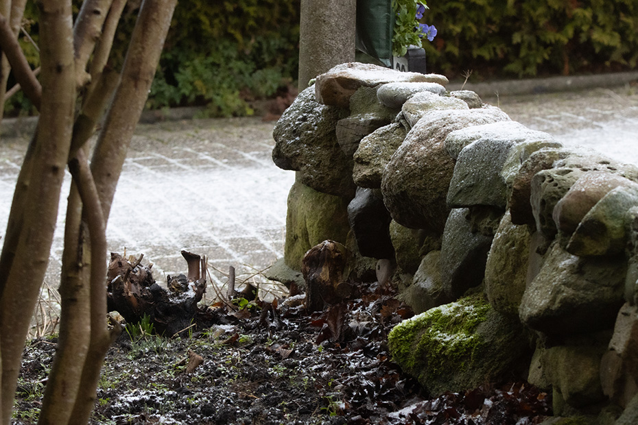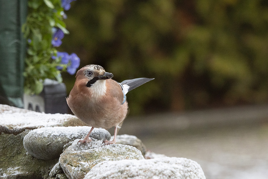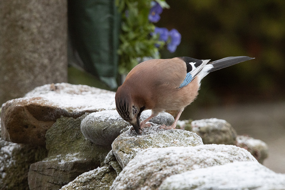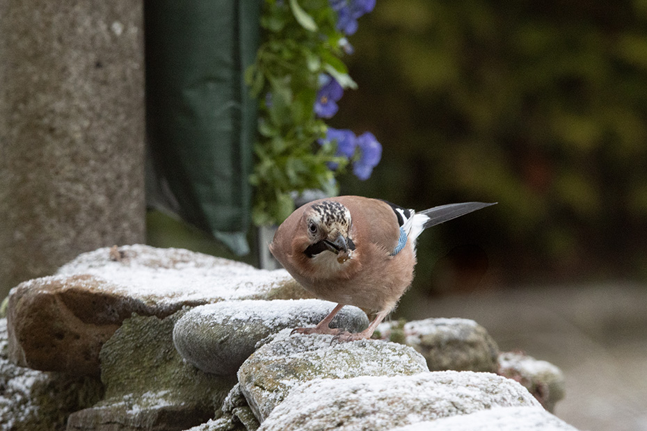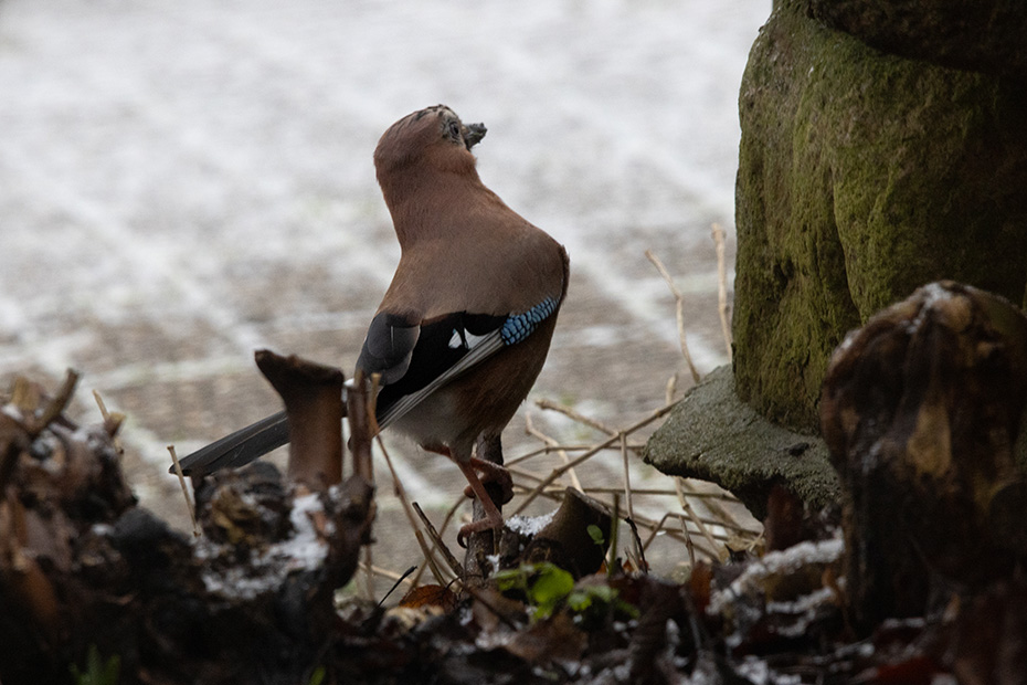 Maar nu verder met een actueel onderwerp: de gaai en een beetje sneeuw. Hoewel ‘sneeuw’ misschien wat overdreven klinkt voor het dunne laagje poedersneeuw; desondanks zorgde het toch voor een winters karakter.