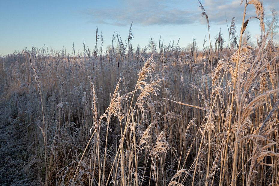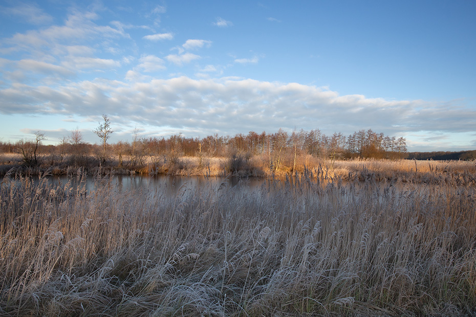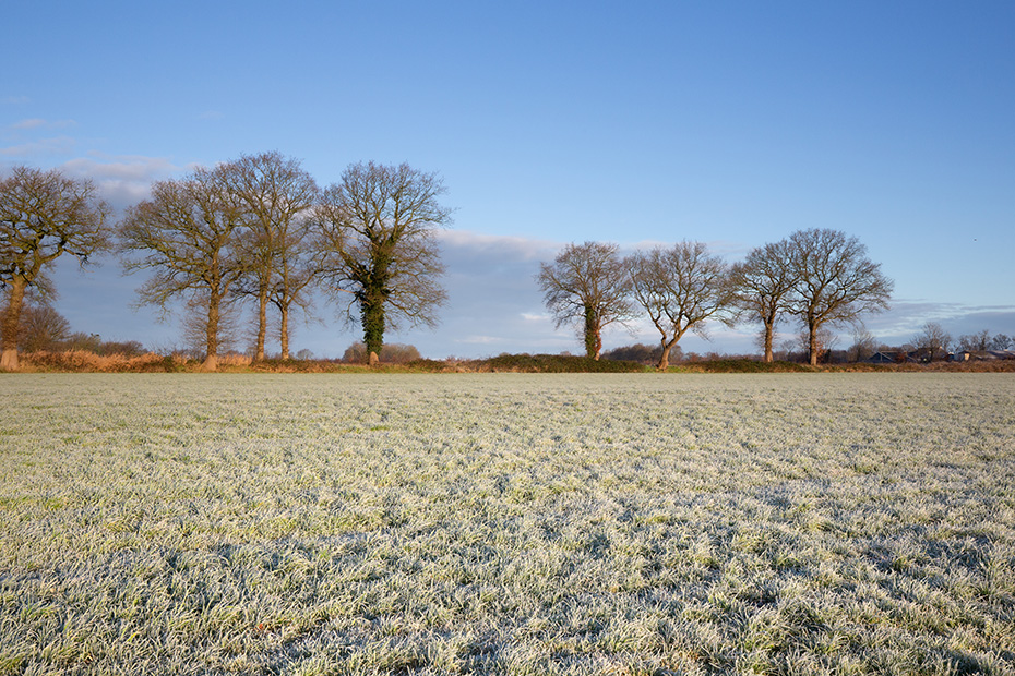 Op de voorgrond lag een berijpt weiland, terwijl op de achtergrond een rij kale bomen zich scherp aftekende tegen de helderblauwe lucht. Vanuit het noorden schoof langzaam een wolkenlucht binnen.
