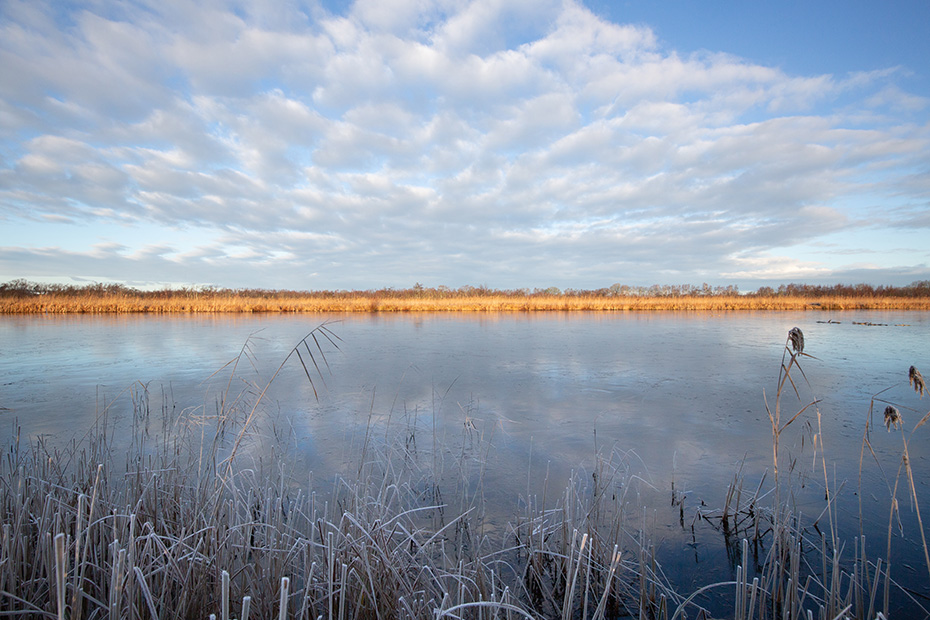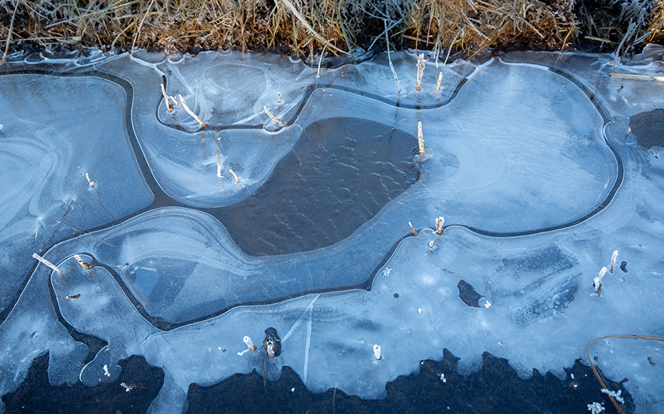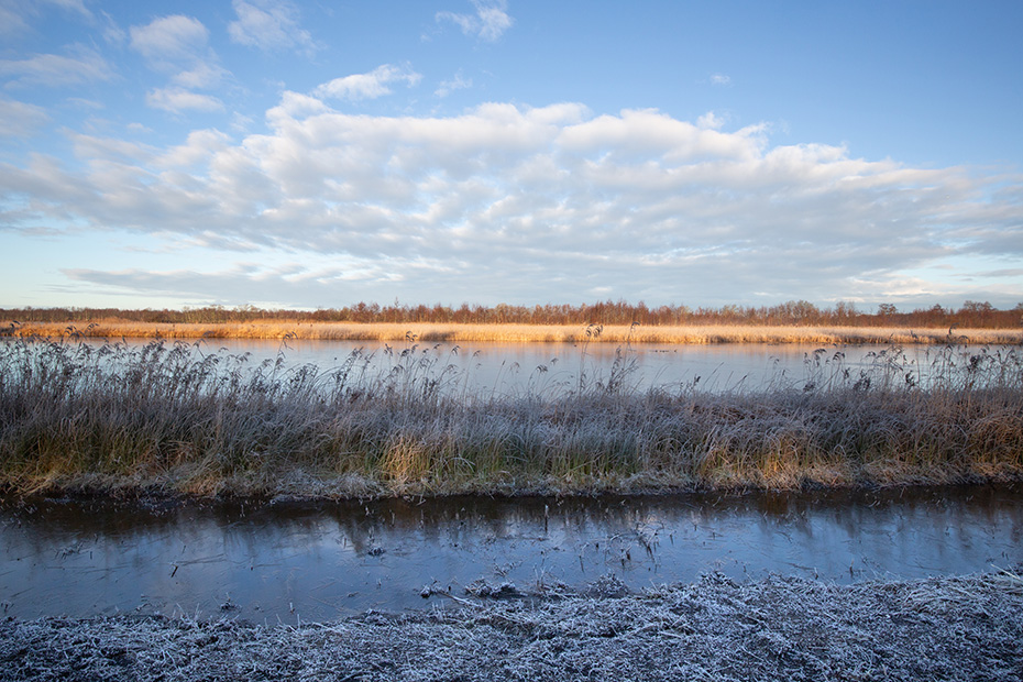 Even verderop parkeerde ik opnieuw de auto langs de weg. Dankzij de bevroren grond was dat geen enkel probleem. Wanneer er ijs ligt gaan waaghalzen vroegtijdig op de plas schaatsen met als gevolg dat er steevast mensen door het ijs zakken. Zodra het schaatsvirus rondwaart, staat er langs deze weg een lange rij auto’s van schaatsliefhebbers. Door de aanleg van het nieuwe fietspad is het nu echter lastiger om het ijs te bereiken. Met laarzen aan waagde ik me op het bomijs en liep naar de oever om de laatste foto van dit vijfluik te maken.