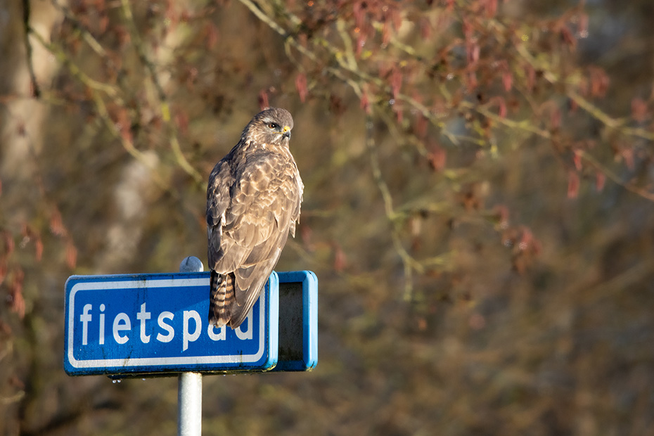Die ochtend zag ik meerdere buizerds, maar de meeste waren me te snel af. Bij één buizerd had ik meer geluk: ik stopte op afstand en kon hem vanuit de auto in alle rust fotograferen.