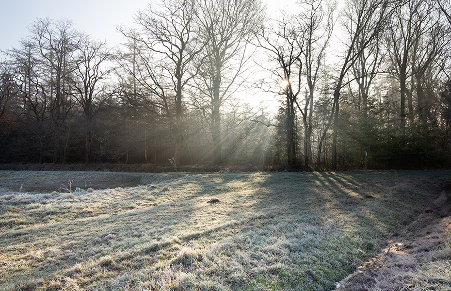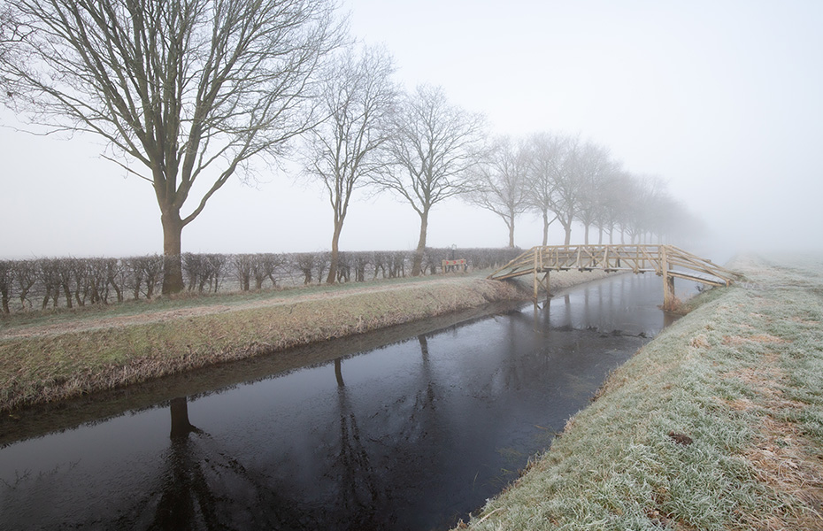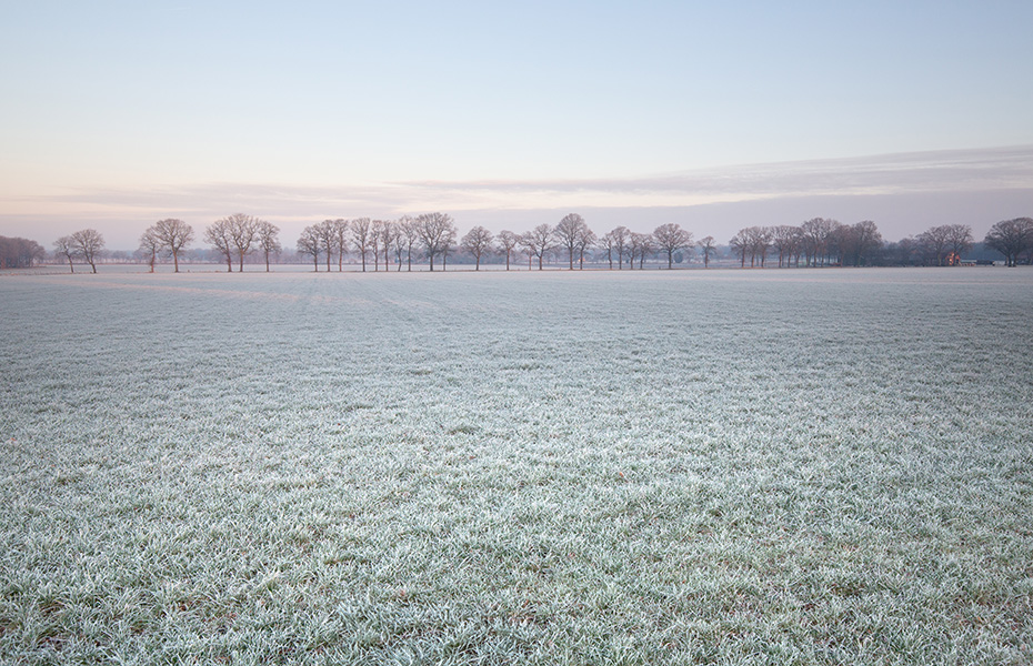 Vanmorgen opende ik het rolgordijn en zag een mooi berijpt landschap. Snel pakte ik mijn cameraspullen en ging op pad. Hoewel er mist was voorspeld, was het een heldere ochtend. Op de Koningin Wilhelminalaan stopte ik om een foto te maken van het berijpte landschap samen met de opkomende zon. De hemel kleurde langzaam in warme tinten, terwijl de eerste zonnestralen de wereld zacht verlichtten. Vervolgens draaide ik me om en maakte een foto richting het westen.