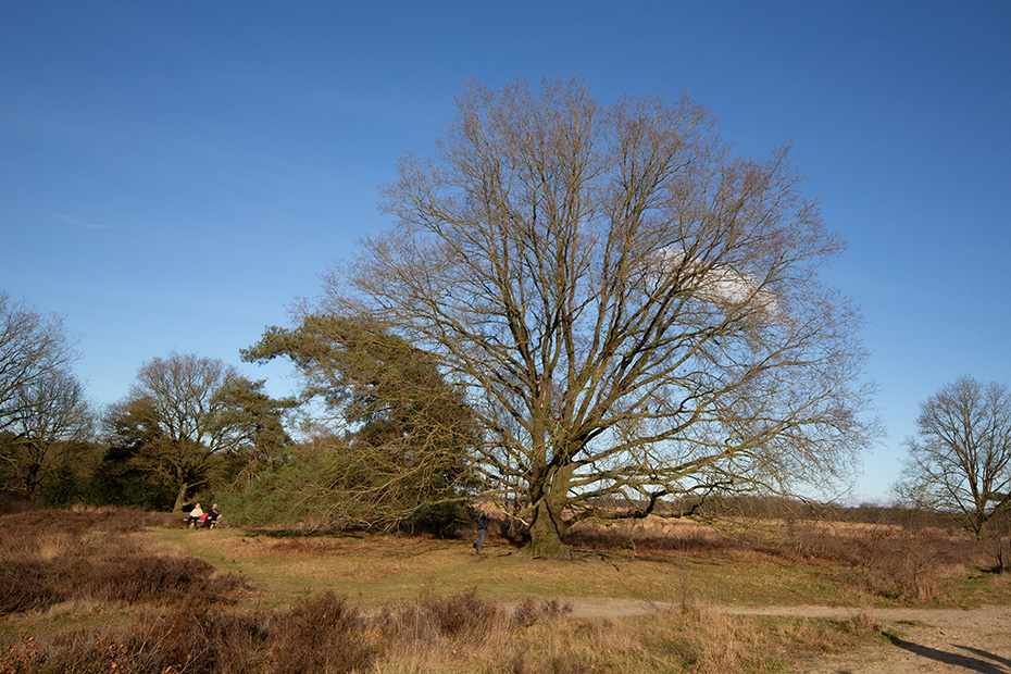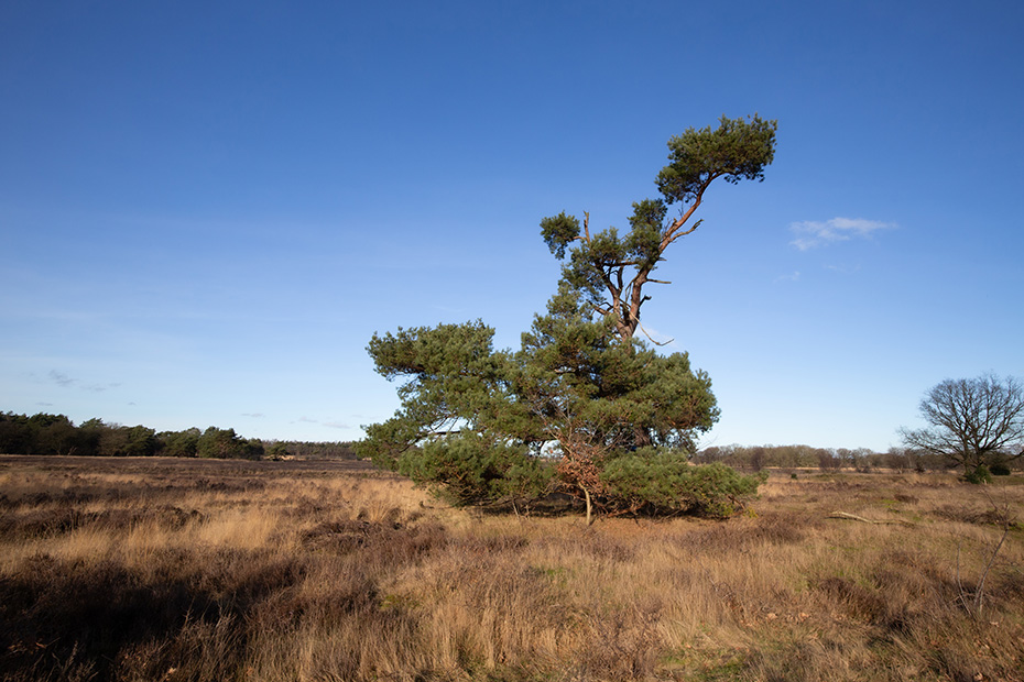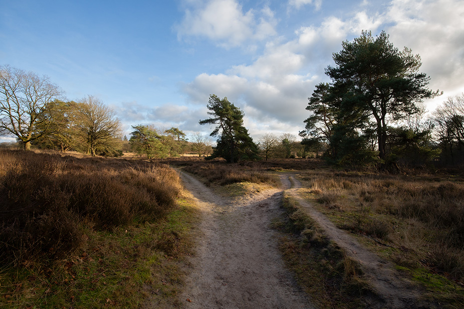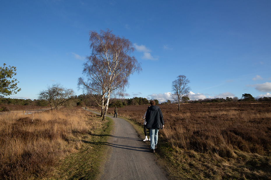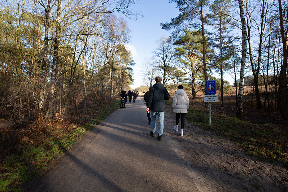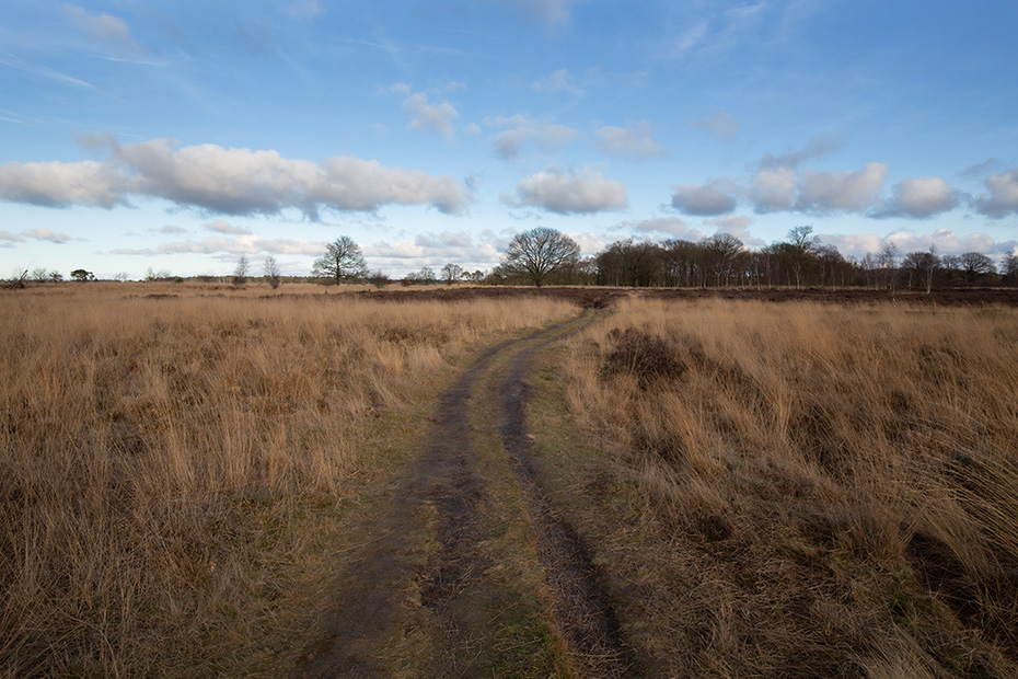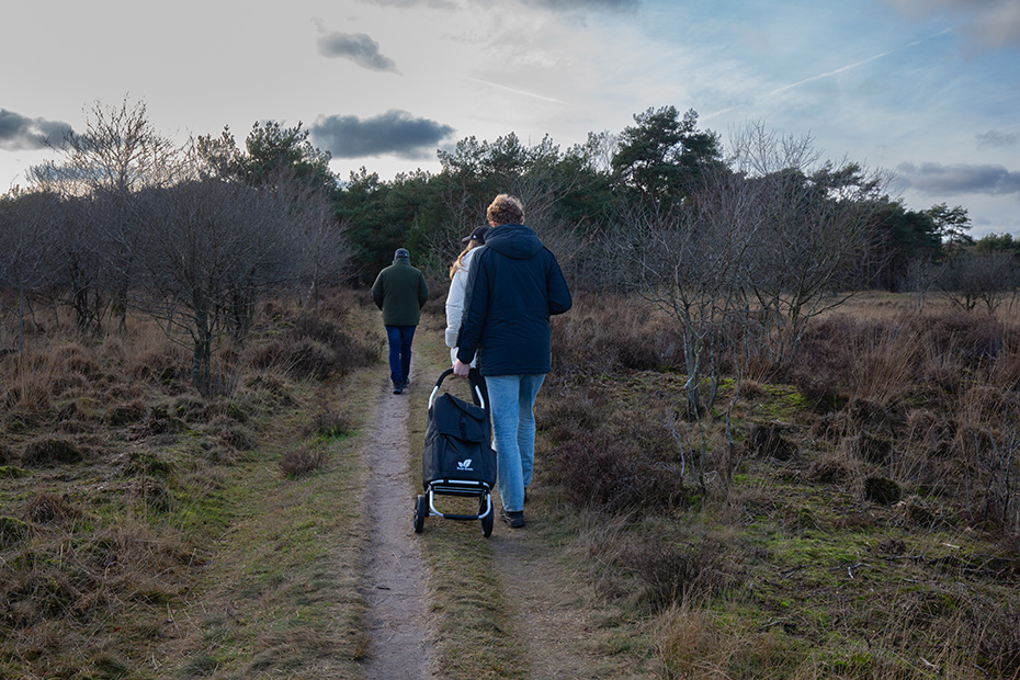 Het eerste deel van onze wandeling volgden we een fietspad. Daarna verlieten we het brede pad en namen we een karrenspoor dat ons dwars over de heide leidde. Voor mijn cameratas op wielen leek dat in eerste instantie niet ideaal, maar al snel bleek dat het prima ging. Ik trok wel wat bekijks met mijn nieuwe tas; een passant zei zelfs dat de Albert Heijn de andere kant op was. Een bijkomend voordeel van de fototas op wielen is dat ook de andere gezinsleden bereid zijn om deze tas te trekken – en dit keer heb ik er zelfs niet om hoeven vragen.