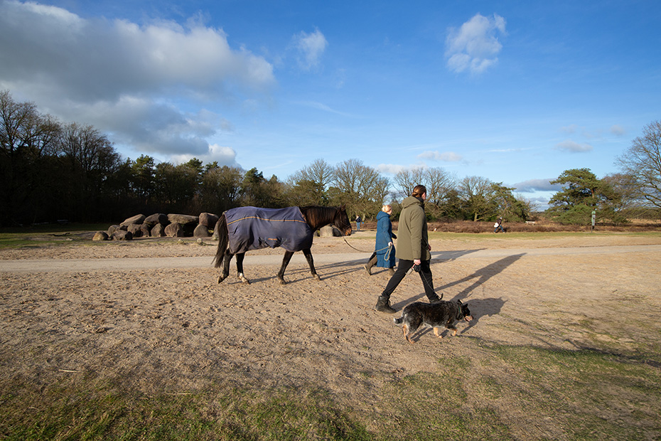 Na een mooie rondwandeling kwamen we weer terug bij het Hunebed, waar we werden verrast door een grappig tafereeltje. Een man en een vrouw waren samen met hun hond en hun paard aan het wandelen. Ik had nog graag de trap willen beklimmen, maar de andere gezinsleden vonden het welletjes. Dus besloot ik een laatste foto te maken aan de voet van de trap, die zich omhoog slingert.