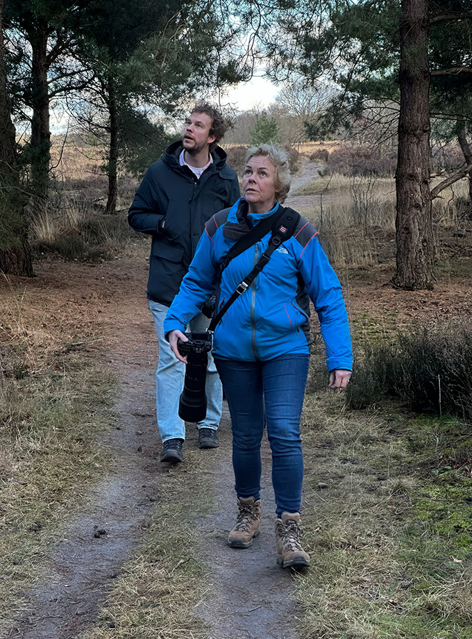 Bij de dennenbomen zagen we een klein vogeltje voorbij fladderen. Merlin Bird meldde dat het een goudhaantje was. Helaas was het vogeltje al gevlogen tegen de tijd dat ik de lens in stelling had. Onze zoon vindt het altijd leuk om samen met mij vogels te spotten. Terwijl onze dochter met haar mobiel een drieluik maakte, moest hij natuurlijk even gek doen met mijn fototas. Onze dochter heeft helemaal niets met vogels spotten en vraagt zich vaak grappend af of ze eigenlijk wel bij dit gezin hoort of dat ze misschien geadopteerd is. 😉