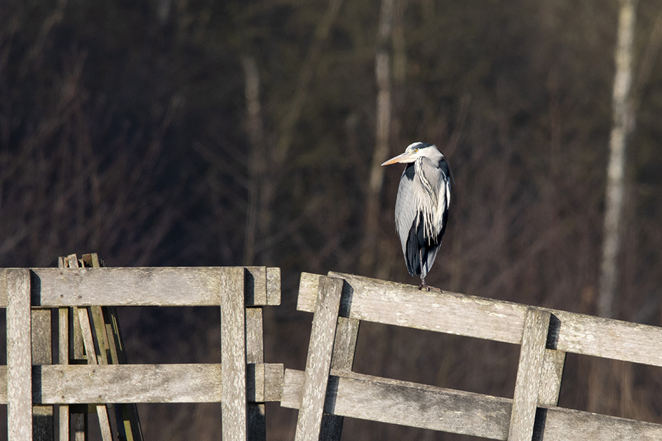 In de verte, op een bruggetje, stond een blauwe reiger. Om deze goed vast te leggen moest ik flink inzoomen. Voorzichtig liep ik die kant op in de hoop een betere foto te maken. De reiger hield me nauwlettend in de gaten. Toen ik te dichtbij kwam vloog hij er met krachtige vleugelslagen vandoor.
