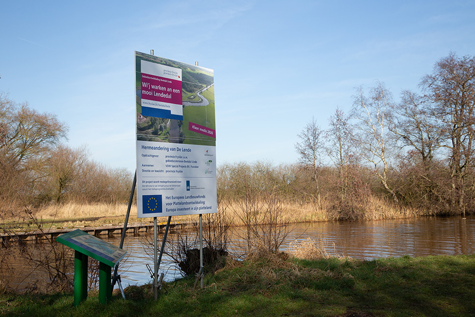 In plaats van mijn auto als kijkhut te gebruiken, besloot ik deze te parkeren en een wandeling te maken. Voordat ik De Lende overstak, nam ik de tijd om het informatiebord over de hermeandering van het riviertje te lezen.