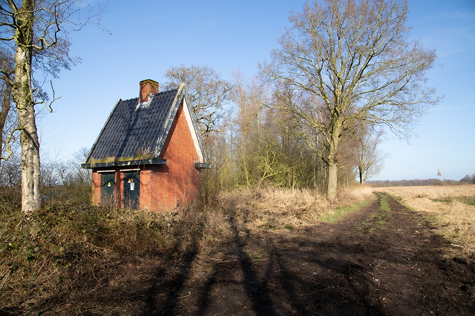 Door de werkzaamheden met groot materieel was het pad lastig begaanbaar. De zwarte aarde maakte het glibberig. Tot mijn verrassing stuitte ik in ´niemandsland´ op een transformatorhuisje. Na het huisje van twee kanten te hebben gefotografeerd, vond ik het welletjes en ben ik teruggelopen.