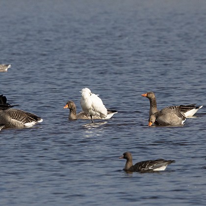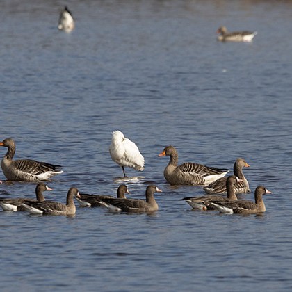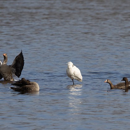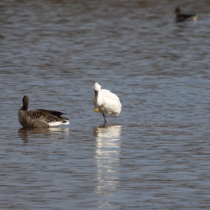 Vanuit de kijkhut had ik uitzicht over een grote plas. In de verte zwom een grote groep ganzen. Te midden van hen stond een witte vogel. Aanvankelijk dacht ik dat het een grote zilverreiger was, maar toen ik door de telelens keek, zag ik dat het een lepelaar was.