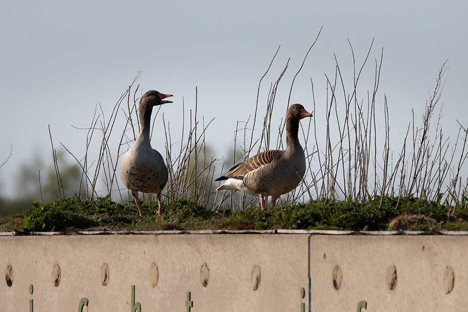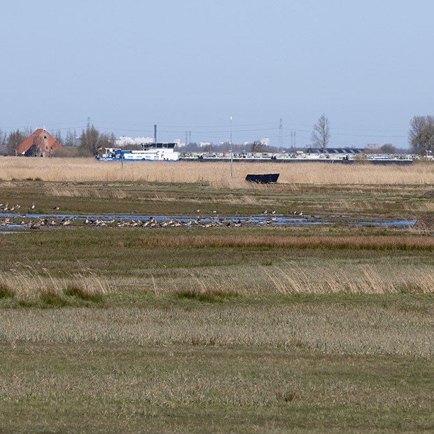 Op de tweede foto vaart een vrachtschip over het Prinses Margrietkanaal. Precies op dat moment ontdekte een van de passagiers een zeearend in het weiland bij een groep grauwe ganzen. Het bleek een jong exemplaar. Voor de volwassen ganzen vormde hij geen direct gevaar, die zijn te groot voor een zeearend. Jonge ganzen daarentegen kunnen wél op het menu staan. Waarschijnlijk was de zeearend daar met een tactiek: door zijn aanwezigheid probeert hij de ganzen op te laten vliegen. In de onrust die dan ontstaat, hoopt hij een andere, kleinere prooi te verrassen en te grijpen.