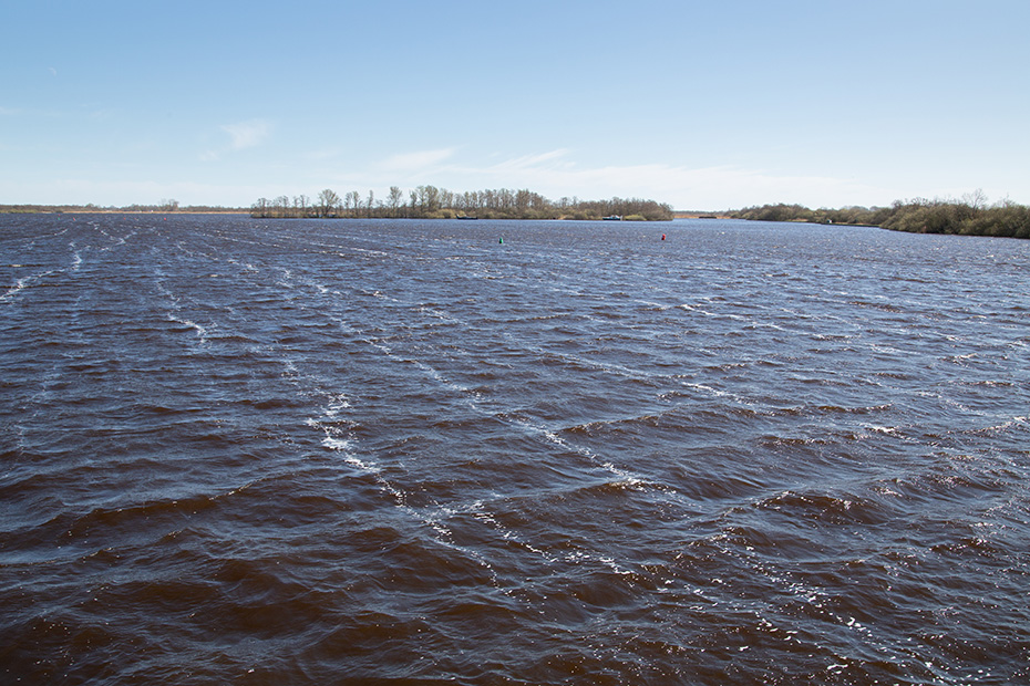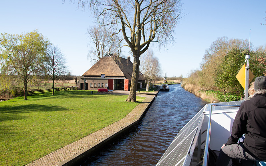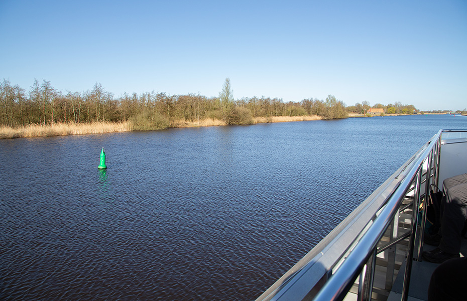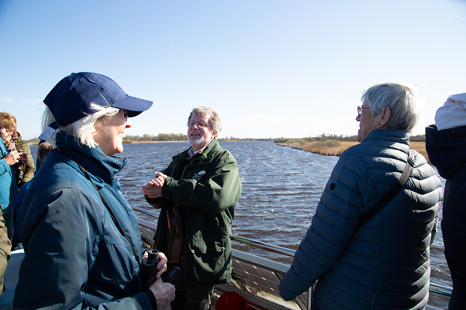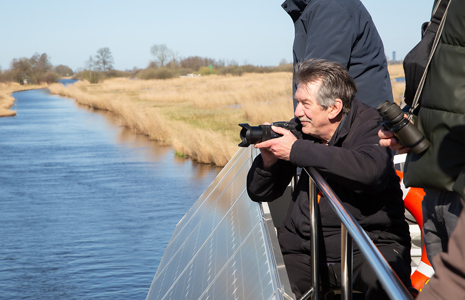 Na een korte introductie door onze gids Andries op het warme benedendek, begaven we ons met z’n allen naar het bovendek. De noordoostenwind was stevig en met slechts 10 graden voelde het fris aan, maar daar kregen we iets moois voor terug: een kraakheldere lucht en een adembenemend uitzicht over het waterrijke landschap.