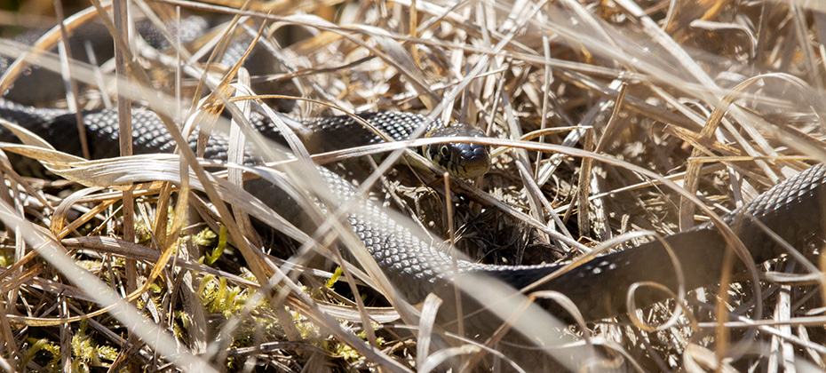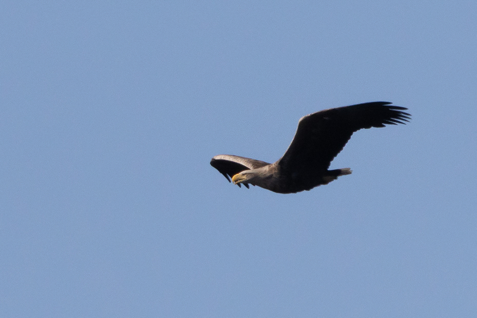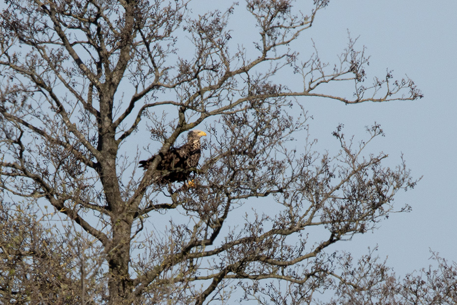 Even verderop wees iemand ons op een zeearend, hoog neergestreken in een boom. Hij zat ver weg, maar met maximaal inzoomen en wat croppen kon ik hem toch nog redelijk vastleggen. Een indrukwekkende verschijning, zelfs op afstand.