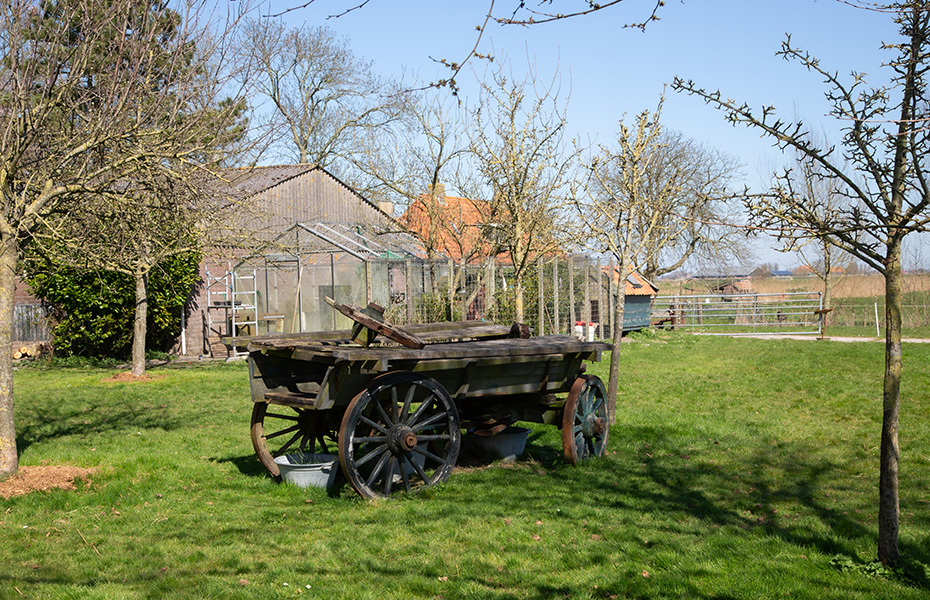 Ik parkeerde mijn auto net buiten het dorp, bij een schuur waar een paar oude koetsjes stonden opgesteld – alsof de tijd er even stil was blijven staan. Aan de overkant zag ik een karakteristieke Friese boerderij met in de tuin een verweerde boerenwagen die het landelijke beeld compleet maakte.