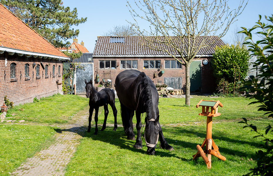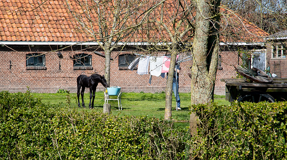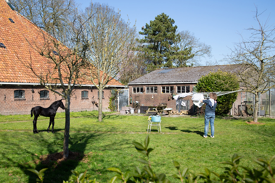 Bij een van de boerderijen stuitte ik op een grappig tafereel: een Fries paard liep samen met haar veulen rustig te grazen op het grasveld in de tuin. Wel handig, zulke levendige grasmaaiers, dan heb je ook geen machine nodig. En de achtergelaten paardenpoep is met een schep snel opgeruimd.